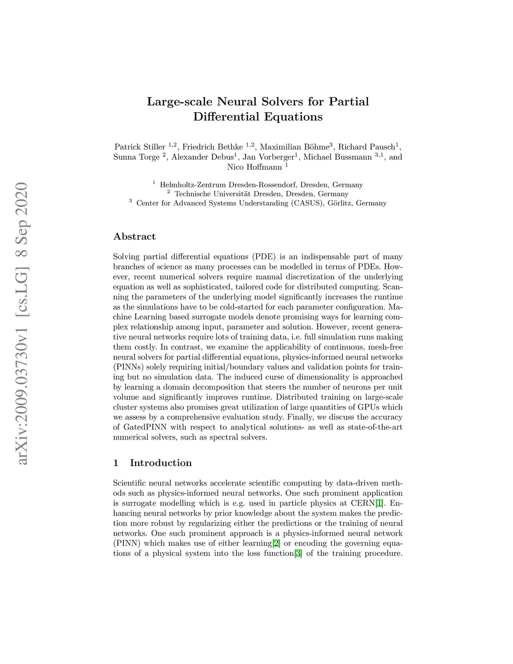 Solving partial differential equations (PDE) is an indispensable part of many branches of science as many processes can be modelled in terms of PDEs. However, recent numerical solvers require manual discretization of the underlying equation as well as sophisticated, tailored code for distributed computing. Scanning the parameters of the underlying model significantly increases the runtime as the simulations have to be cold-started for each parameter configuration. Machine Learning based surrogate models denote promising ways for learning complex relationship among input, parameter and solution. However, recent generative neural networks require lots of training data, i.e. full simulation runs making them costly. In contrast, we examine the applicability of continuous, mesh-free neural solvers for partial differential equations, physics-informed neural networks (PINNs) solely requiring initial/boundary values and validation points for training but no simulation data. The induced curse of dimensionality is approached by learning a domain decomposition that steers the number of neurons per unit volume and significantly improves runtime. Distributed training on large-scale cluster systems also promises great utilization of large quantities of GPUs which we assess by a comprehensive evaluation study. Finally, we discuss the accuracy of GatedPINN with respect to analytical solutions -- as well as state-of-the-art numerical solvers, such as spectral solvers.