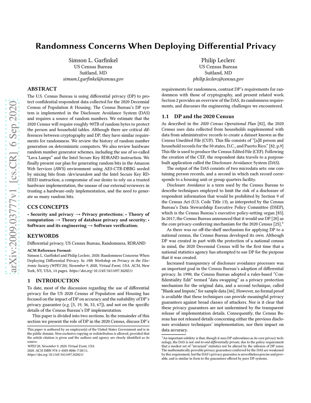 The U.S. Census Bureau is using differential privacy (DP) to protect confidential respondent data collected for the 2020 Decennial Census of Population & Housing. The Census Bureau's DP system is implemented in the Disclosure Avoidance System (DAS) and requires a source of random numbers. We estimate that the 2020 Census will require roughly 90TB of random bytes to protect the person and household tables. Although there are critical differences between cryptography and DP, they have similar requirements for randomness. We review the history of random number generation on deterministic computers, including von Neumann's "middle-square" method, Mersenne Twister (MT19937) (previously the default NumPy random number generator, which we conclude is unacceptable for use in production privacy-preserving systems), and the Linux /dev/urandom device. We also review hardware random number generator schemes, including the use of so-called "Lava Lamps" and the Intel Secure Key RDRAND instruction. We finally present our plan for generating random bits in the Amazon Web Services (AWS) environment using AES-CTR-DRBG seeded by mixing bits from /dev/urandom and the Intel Secure Key RDSEED instruction, a compromise of our desire to rely on a trusted hardware implementation, the unease of our external reviewers in trusting a hardware-only implementation, and the need to generate so many random bits.
