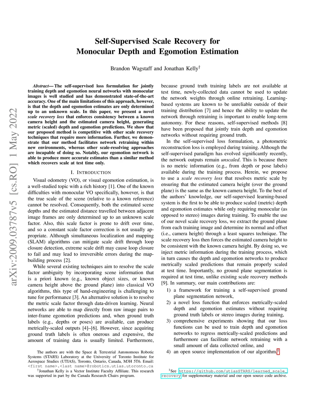 Self-Supervised Scale Recovery for Monocular Depth and Egomotion