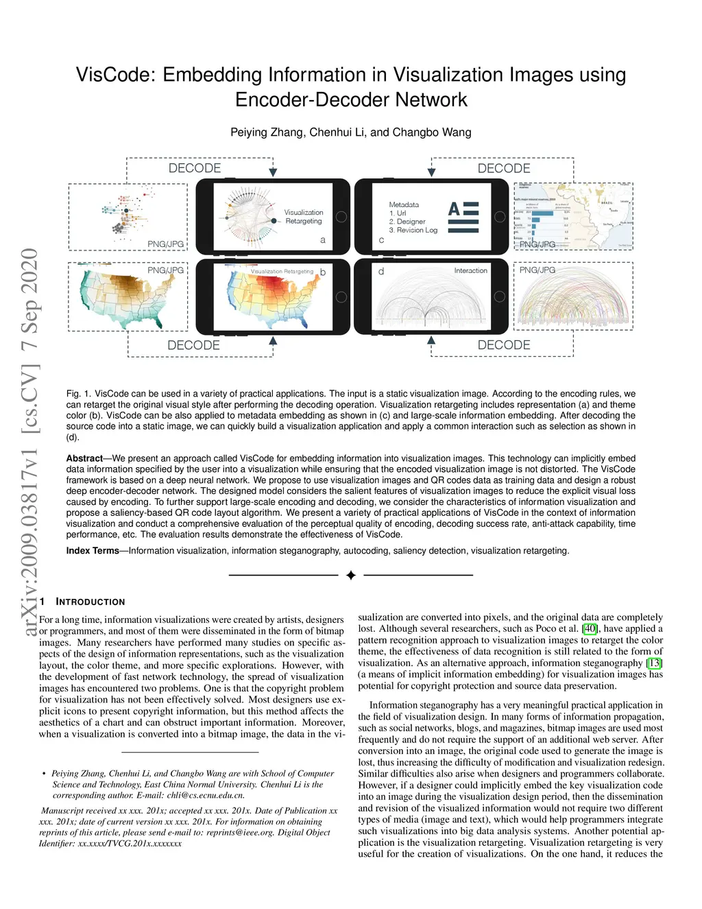 We present an approach called VisCode for embedding information into visualization images. This technology can implicitly embed data information specified by the user into a visualization while ensuring that the encoded visualization image is not distorted. The VisCode framework is based on a deep neural network. We propose to use visualization images and QR codes data as training data and design a robust deep encoder-decoder network. The designed model considers the salient features of visualization images to reduce the explicit visual loss caused by encoding. To further support large-scale encoding and decoding, we consider the characteristics of information visualization and propose a saliency-based QR code layout algorithm. We present a variety of practical applications of VisCode in the context of information visualization and conduct a comprehensive evaluation of the perceptual quality of encoding, decoding success rate, anti-attack capability, time performance, etc. The evaluation results demonstrate the effectiveness of VisCode.