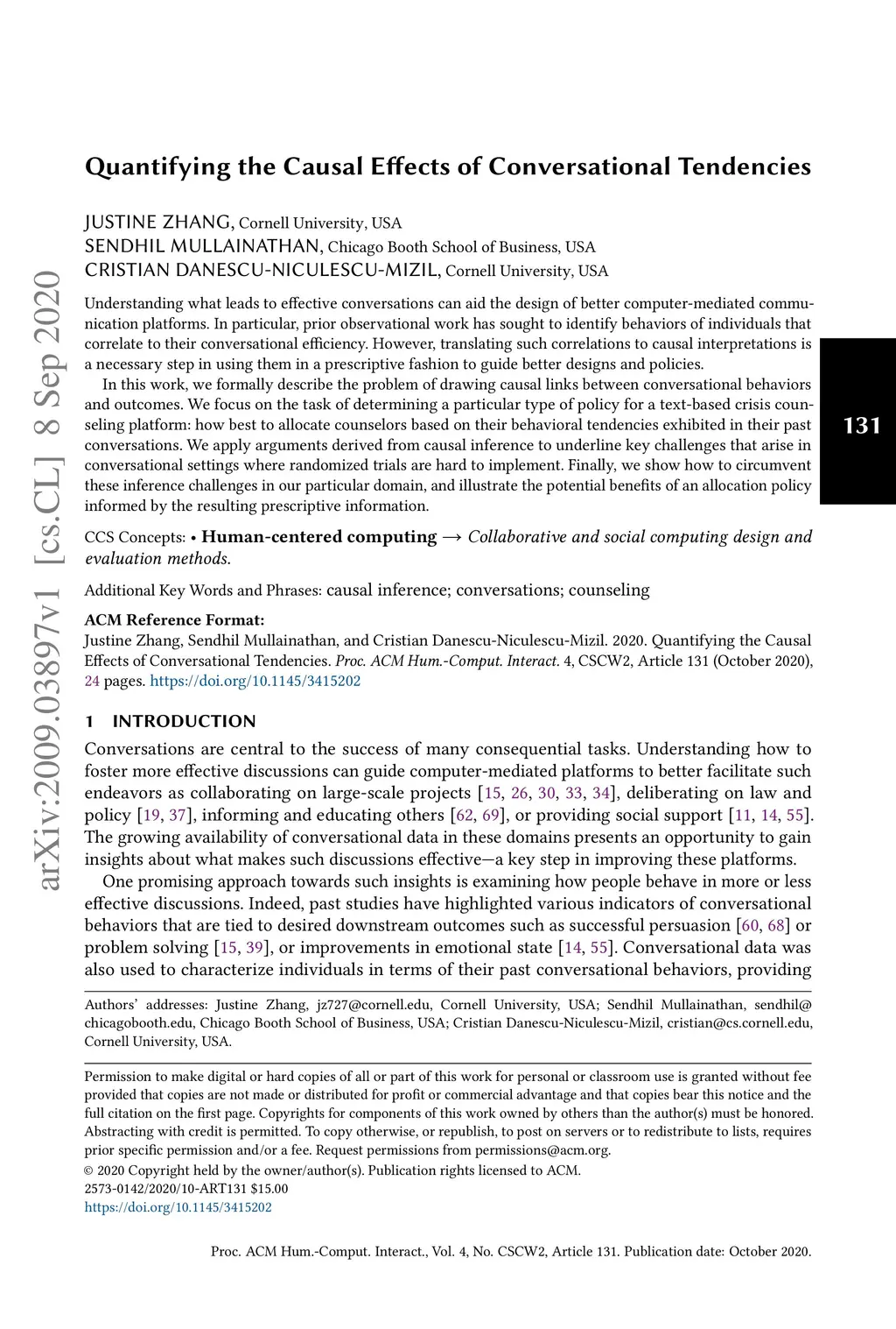 Understanding what leads to effective conversations can aid the design of better computer-mediated communication platforms. In particular, prior observational work has sought to identify behaviors of individuals that correlate to their conversational efficiency. However, translating such correlations to causal interpretations is a necessary step in using them in a prescriptive fashion to guide better designs and policies. In this work, we formally describe the problem of drawing causal links between conversational behaviors and outcomes. We focus on the task of determining a particular type of policy for a text-based crisis counseling platform: how best to allocate counselors based on their behavioral tendencies exhibited in their past conversations. We apply arguments derived from causal inference to underline key challenges that arise in conversational settings where randomized trials are hard to implement. Finally, we show how to circumvent these inference challenges in our particular domain, and illustrate the potential benefits of an allocation policy informed by the resulting prescriptive information.