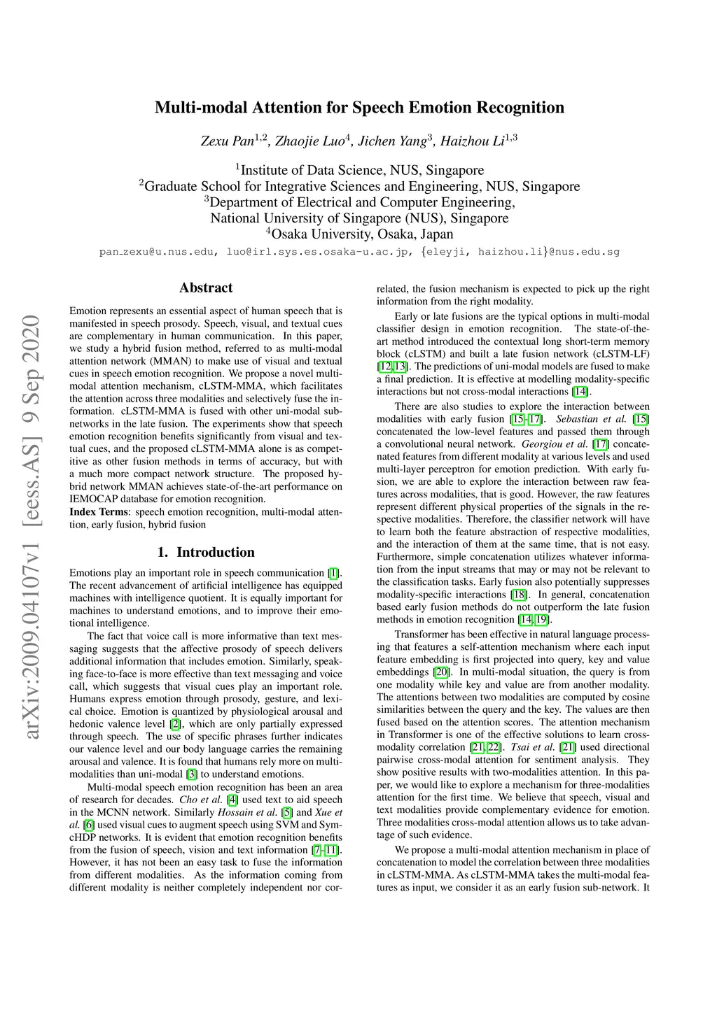 Emotion represents an essential aspect of human speech that is manifested in speech prosody. Speech, visual, and textual cues are complementary in human communication. In this paper, we study a hybrid fusion method, referred to as multi-modal attention network (MMAN) to make use of visual and textual cues in speech emotion recognition. We propose a novel multi-modal attention mechanism, cLSTM-MMA, which facilitates the attention across three modalities and selectively fuse the information. cLSTM-MMA is fused with other uni-modal sub-networks in the late fusion. The experiments show that speech emotion recognition benefits significantly from visual and textual cues, and the proposed cLSTM-MMA alone is as competitive as other fusion methods in terms of accuracy, but with a much more compact network structure. The proposed hybrid network MMAN achieves state-of-the-art performance on IEMOCAP database for emotion recognition.