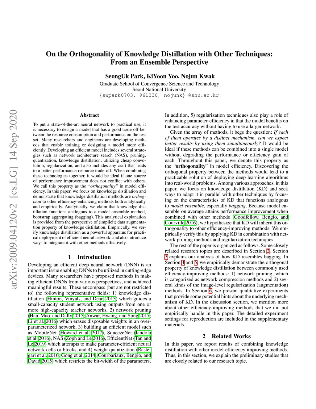 To put a state-of-the-art neural network to practical use, it is necessary to design a model that has a good trade-off between the resource consumption and performance on the test set. Many researchers and engineers are developing methods that enable training or designing a model more efficiently. Developing an efficient model includes several strategies such as network architecture search, pruning, quantization, knowledge distillation, utilizing cheap convolution, regularization, and also includes any craft that leads to a better performance-resource trade-off. When combining these technologies together, it would be ideal if one source of performance improvement does not conflict with others. We call this property as the orthogonality in model efficiency. In this paper, we focus on knowledge distillation and demonstrate that knowledge distillation methods are orthogonal to other efficiency-enhancing methods both analytically and empirically. Analytically, we claim that knowledge distillation functions analogous to a ensemble method, bootstrap aggregating. This analytical explanation is provided from the perspective of implicit data augmentation property of knowledge distillation. Empirically, we verify knowledge distillation as a powerful apparatus for practical deployment of efficient neural network, and also introduce ways to integrate it with other methods effectively.