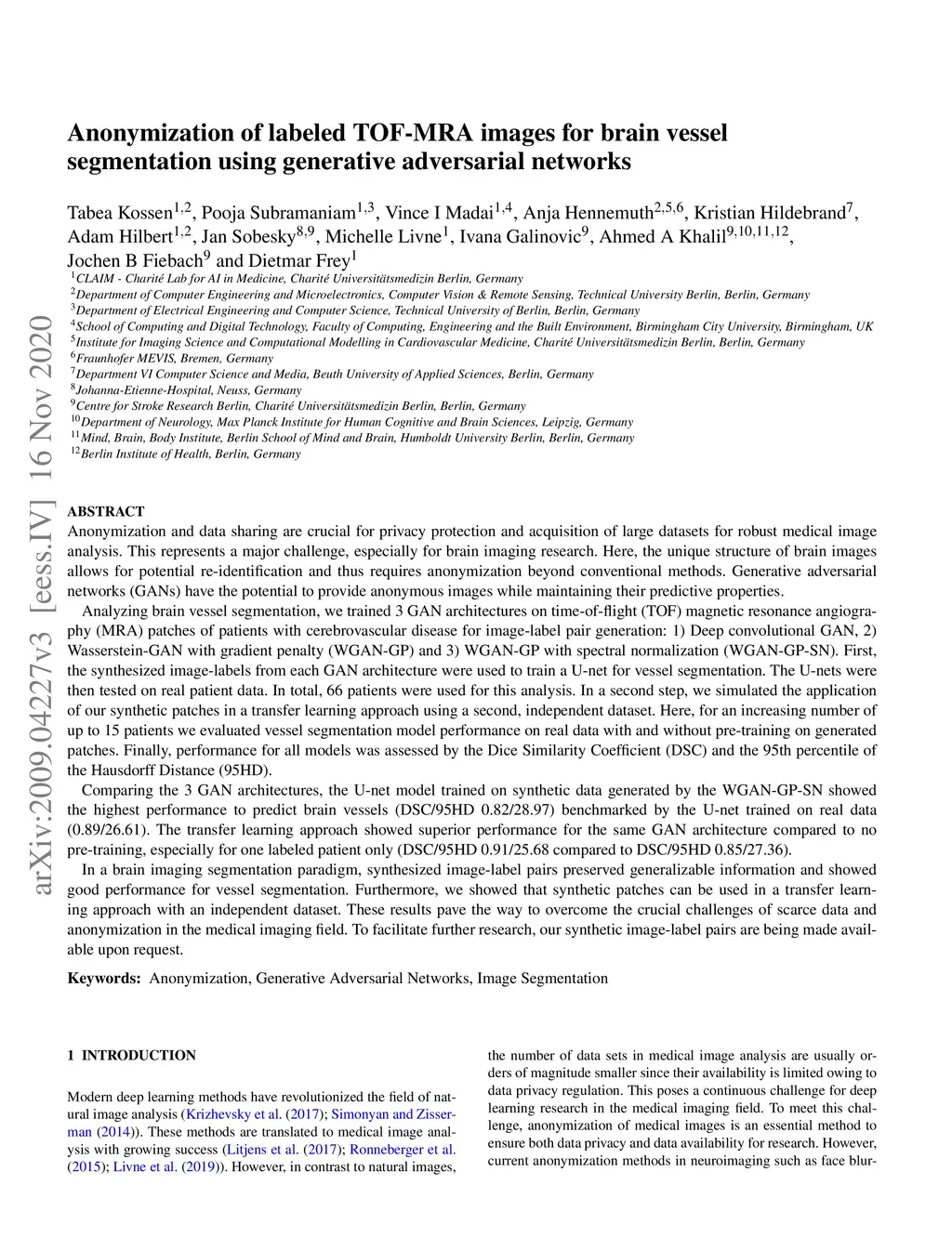 Anonymization of labeled TOF-MRA images for brain vessel segmentation
