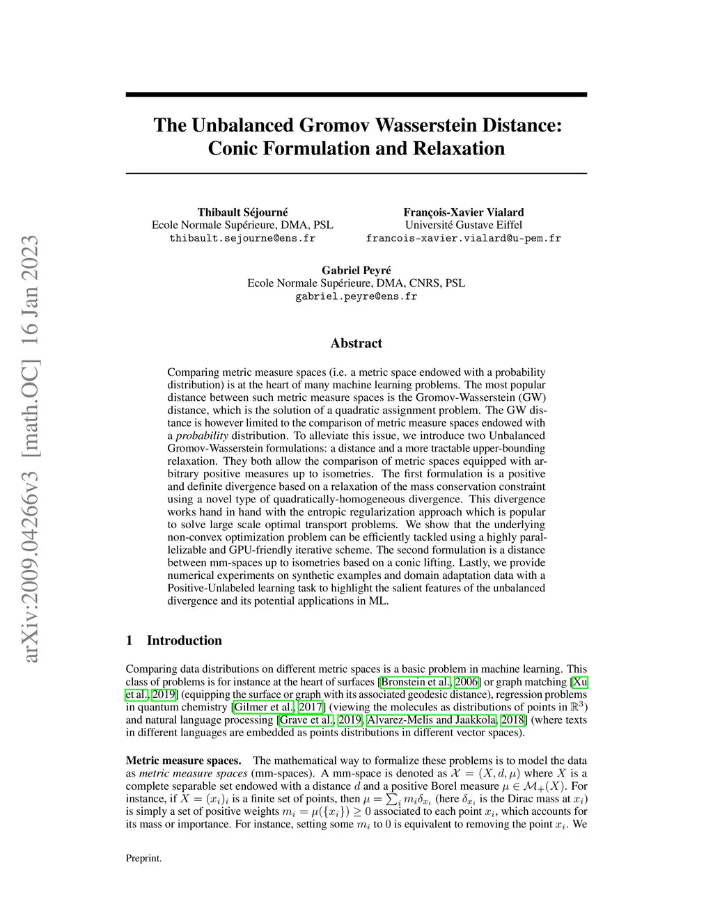 Comparing metric measure spaces (i.e. a metric space endowed with aprobability distribution) is at the heart of many machine learning problems. The most popular distance between such metric measure spaces is theGromov-Wasserstein (GW) distance, which is the solution of a quadratic assignment problem. The GW distance is however limited to the comparison of metric measure spaces endowed with a probability distribution. To alleviate this issue, we introduce two Unbalanced Gromov-Wasserstein formulations: a distance and a more tractable upper-bounding relaxation.They both allow the comparison of metric spaces equipped with arbitrary positive measures up to isometries. The first formulation is a positive and definite divergence based on a relaxation of the mass conservation constraint using a novel type of quadratically-homogeneous divergence. This divergence works hand in hand with the entropic regularization approach which is popular to solve large scale optimal transport problems. We show that the underlying non-convex optimization problem can be efficiently tackled using a highly parallelizable and GPU-friendly iterative scheme. The second formulation is a distance between mm-spaces up to isometries based on a conic lifting. Lastly, we provide numerical experiments onsynthetic examples and domain adaptation data with a Positive-Unlabeled learning task to highlight the salient features of the unbalanced divergence and its potential applications in ML.