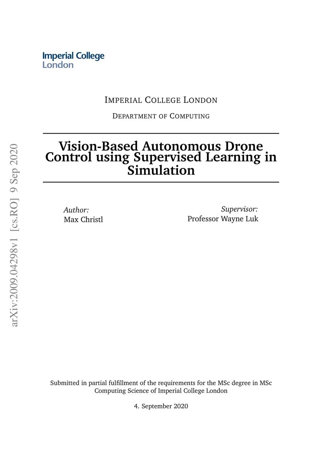 Vision-Based Autonomous Drone Control using Supervised Learning in