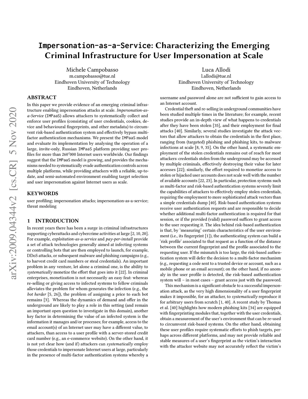 In this paper we provide evidence of an emerging criminal infrastructure enabling impersonation attacks at scale. Impersonation-as-a-Service (ImpaaS) allows attackers to systematically collect and enforce user profiles (consisting of user credentials, cookies, device and behavioural fingerprints, and other metadata) to circumvent risk-based authentication system and effectively bypass multi-factor authentication mechanisms. We present the ImpaaS model and evaluate its implementation by analysing the operation of a large, invite-only, Russian ImpaaS platform providing user profiles for more than Internet users worldwide. Our findings suggest that the ImpaaS model is growing, and provides the mechanisms needed to systematically evade authentication controls across multiple platforms, while providing attackers with a reliable, up-to-date, and semi-automated environment enabling target selection and user impersonation against Internet users as scale.