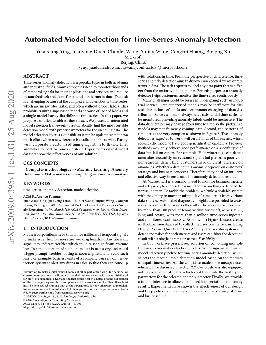 Time-series anomaly detection is a popular topic in both academia and industrial fields. Many companies need to monitor thousands of temporal signals for their applications and services and require instant feedback and alerts for potential incidents in time. The task is challenging because of the complex characteristics of time-series, which are messy, stochastic, and often without proper labels. This prohibits training supervised models because of lack of labels and a single model hardly fits different time series. In this paper, we propose a solution to address these issues. We present an automated model selection framework to automatically find the most suitable detection model with proper parameters for the incoming data. The model selection layer is extensible as it can be updated without too much effort when a new detector is available to the service. Finally, we incorporate a customized tuning algorithm to flexibly filter anomalies to meet customers' criteria. Experiments on real-world datasets show the effectiveness of our solution.