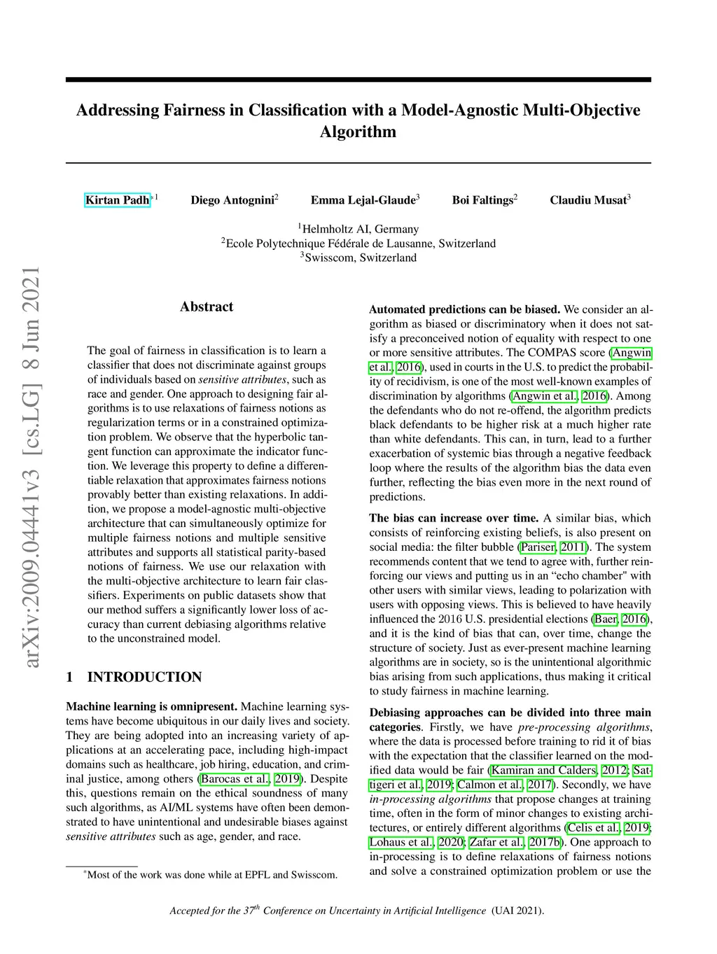 The goal of fairness in classification is to learn a classifier that does not discriminate against groups of individuals based on sensitive attributes, such as race and gender. One approach to designing fair algorithms is to use relaxations of fairness notions as regularization terms or in a constrained optimization problem. We observe that the hyperbolic tangent function can approximate the indicator function. We leverage this property to define a differentiable relaxation that approximates fairness notions provably better than existing relaxations. In addition, we propose a model-agnostic multi-objective architecture that can simultaneously optimize for multiple fairness notions and multiple sensitive attributes and supports all statistical parity-based notions of fairness. We use our relaxation with the multi-objective architecture to learn fair classifiers. Experiments on public datasets show that our method suffers a significantly lower loss of accuracy than current debiasing algorithms relative to the unconstrained model.