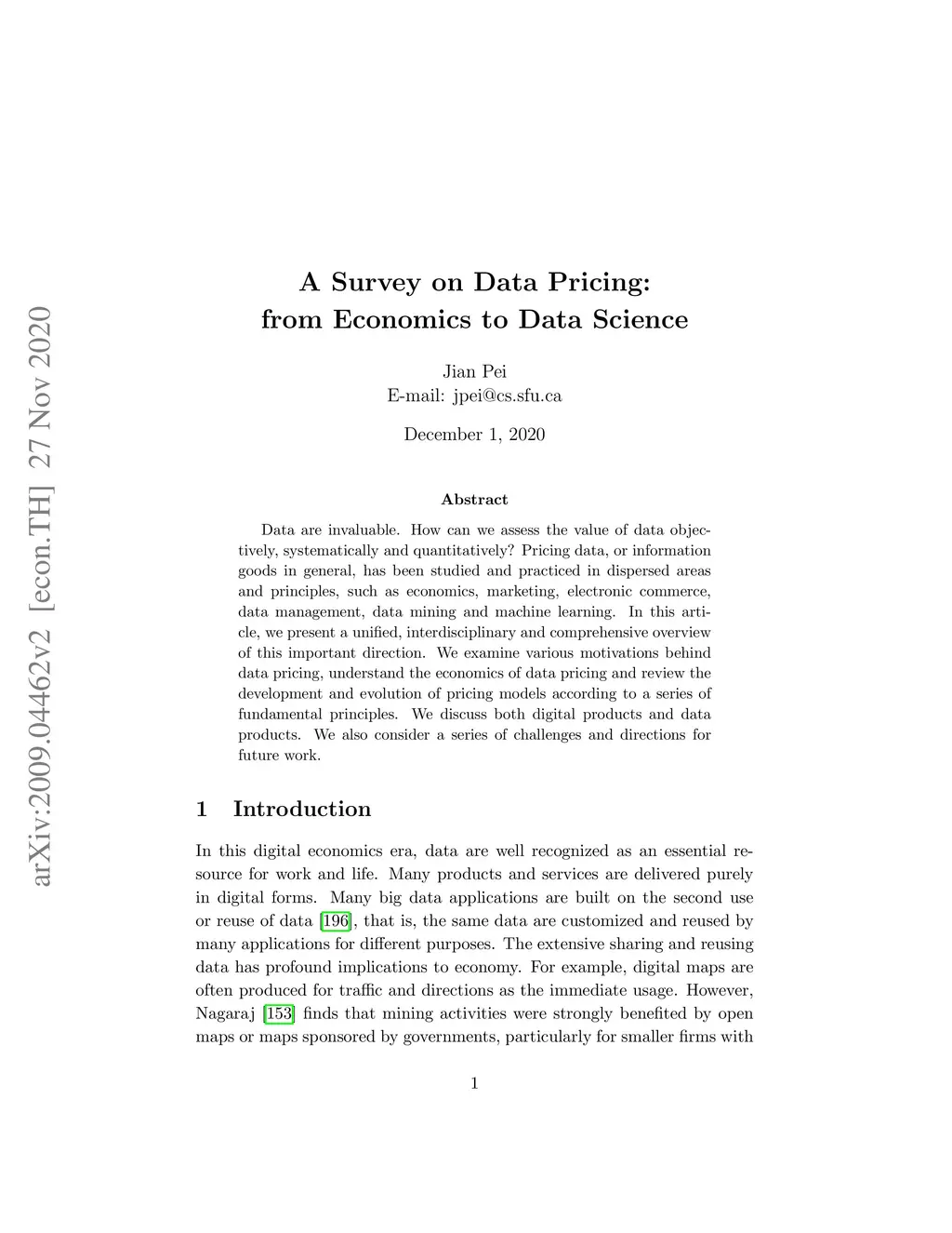 Data are invaluable. How can we assess the value of data objectively, systematically and quantitatively? Pricing data, or information goods in general, has been studied and practiced in dispersed areas and principles, such as economics, marketing, electronic commerce, data management, data mining and machine learning. In this article, we present a unified, interdisciplinary and comprehensive overview of this important direction. We examine various motivations behind data pricing, understand the economics of data pricing and review the development and evolution of pricing models according to a series of fundamental principles. We discuss both digital products and data products. We also consider a series of challenges and directions for future work.