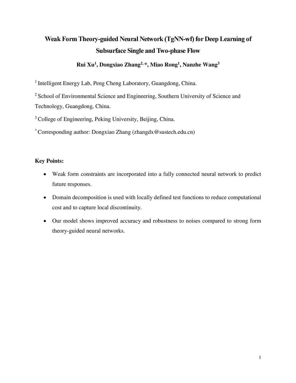 Deep neural networks (DNNs) are widely used as surrogate models in geophysical applications; incorporating theoretical guidance into DNNs has improved the generalizability. However, most of such approaches define the loss function based on the strong form of conservation laws (via partial differential equations, PDEs), which is subject to deteriorated accuracy when the PDE has high order derivatives or the solution has strong discontinuities. Herein, we propose a weak form theory-guided neural network (TgNN-wf), which incorporates the weak form formulation of the PDE into the loss function combined with data constraint and initial and boundary conditions regularizations to tackle the aforementioned difficulties. In the weak form, high order derivatives in the PDE can be transferred to the test functions by performing integration-by-parts, which reduces computational error. We use domain decomposition with locally defined test functions, which captures local discontinuity effectively. Two numerical cases demonstrate the superiority of the proposed TgNN-wf over the strong form TgNN, including the hydraulic head prediction for unsteady-state 2D single-phase flow problems and the saturation profile prediction for 1D two-phase flow problems. Results show that TgNN-wf consistently has higher accuracy than TgNN, especially when strong discontinuity in the solution is present. TgNN-wf also trains faster than TgNN when the number of integration subdomains is not too large (<10,000). Moreover, TgNN-wf is more robust to noises. Thus, the proposed TgNN-wf paves the way for which a variety of deep learning problems in the small data regime can be solved more accurately and efficiently.