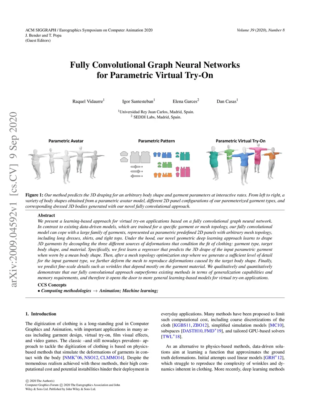 We present a learning-based approach for virtual try-on applications based on a fully convolutional graph neural network. In contrast to existing data-driven models, which are trained for a specific garment or mesh topology, our fully convolutional model can cope with a large family of garments, represented as parametric predefined 2D panels with arbitrary mesh topology, including long dresses, shirts, and tight tops. Under the hood, our novel geometric deep learning approach learns to drape 3D garments by decoupling the three different sources of deformations that condition the fit of clothing: garment type, target body shape, and material. Specifically, we first learn a regressor that predicts the 3D drape of the input parametric garment when worn by a mean body shape. Then, after a mesh topology optimization step where we generate a sufficient level of detail for the input garment type, we further deform the mesh to reproduce deformations caused by the target body shape. Finally, we predict fine-scale details such as wrinkles that depend mostly on the garment material. We qualitatively and quantitatively demonstrate that our fully convolutional approach outperforms existing methods in terms of generalization capabilities and memory requirements, and therefore it opens the door to more general learning-based models for virtual try-on applications.