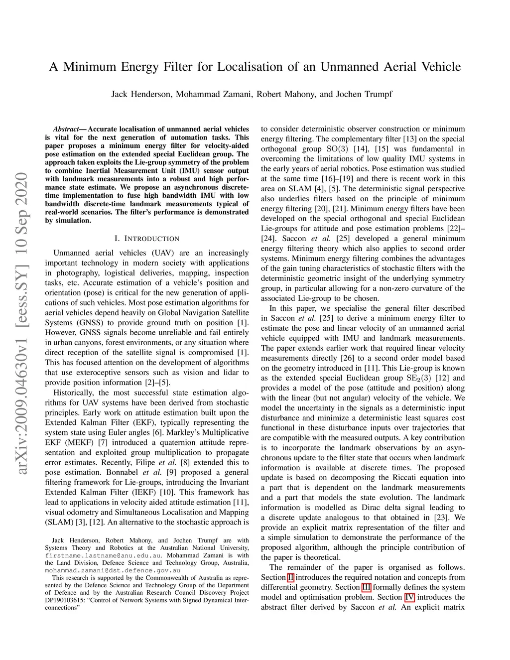 A Minimum Energy Filter for Localisation of an Unmanned Aerial Vehicle