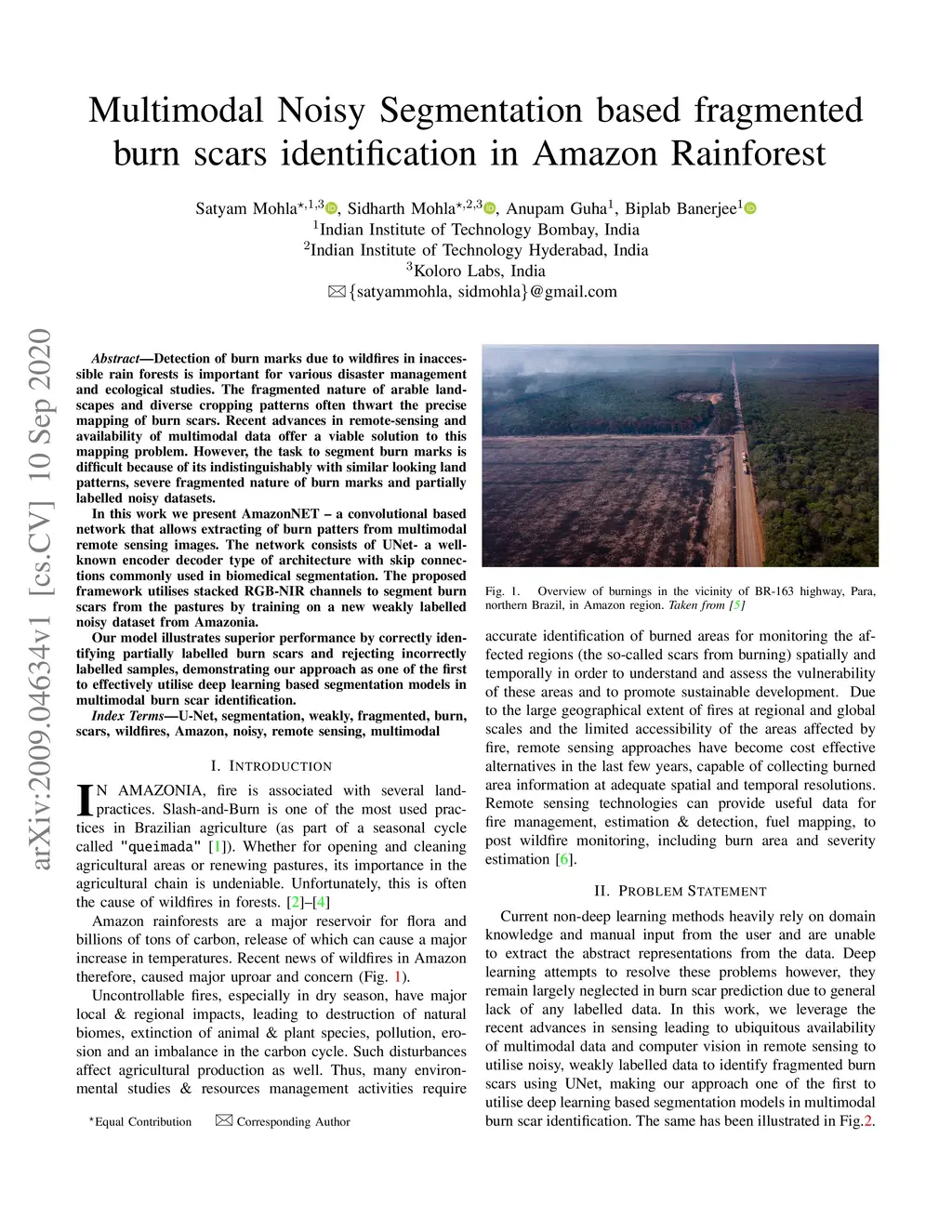 Detection of burn marks due to wildfires in inaccessible rain forests is important for various disaster management and ecological studies. The fragmented nature of arable landscapes and diverse cropping patterns often thwart the precise mapping of burn scars. Recent advances in remote-sensing and availability of multimodal data offer a viable solution to this mapping problem. However, the task to segment burn marks is difficult because of its indistinguishably with similar looking land patterns, severe fragmented nature of burn marks and partially labelled noisy datasets. In this work we present AmazonNET -- a convolutional based network that allows extracting of burn patters from multimodal remote sensing images. The network consists of UNet: a well-known encoder decoder type of architecture with skip connections commonly used in biomedical segmentation. The proposed framework utilises stacked RGB-NIR channels to segment burn scars from the pastures by training on a new weakly labelled noisy dataset from Amazonia. Our model illustrates superior performance by correctly identifying partially labelled burn scars and rejecting incorrectly labelled samples, demonstrating our approach as one of the first to effectively utilise deep learning based segmentation models in multimodal burn scar identification.
