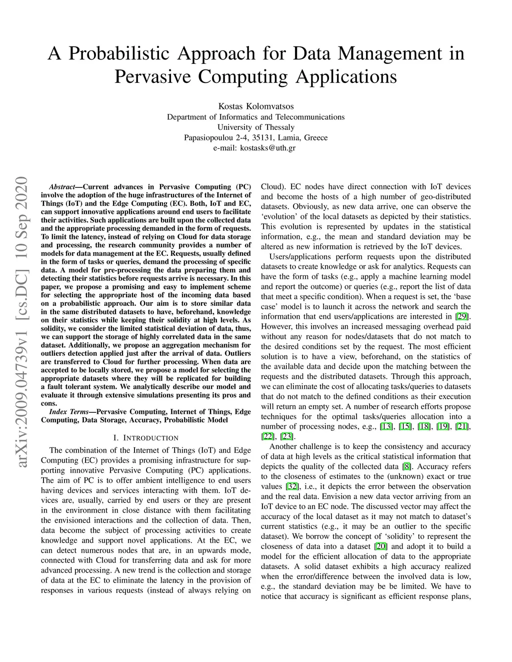 Current advances in Pervasive Computing (PC) involve the adoption of the huge infrastructures of the Internet of Things (IoT) and the Edge Computing (EC). Both, IoT and EC, can support innovative applications around end users to facilitate their activities. Such applications are built upon the collected data and the appropriate processing demanded in the form of requests. To limit the latency, instead of relying on Cloud for data storage and processing, the research community provides a number of models for data management at the EC. Requests, usually defined in the form of tasks or queries, demand the processing of specific data. A model for pre-processing the data preparing them and detecting their statistics before requests arrive is necessary. In this paper, we propose a promising and easy to implement scheme for selecting the appropriate host of the incoming data based on a probabilistic approach. Our aim is to store similar data in the same distributed datasets to have, beforehand, knowledge on their statistics while keeping their solidity at high levels. As solidity, we consider the limited statistical deviation of data, thus, we can support the storage of highly correlated data in the same dataset. Additionally, we propose an aggregation mechanism for outliers detection applied just after the arrival of data. Outliers are transferred to Cloud for further processing. When data are accepted to be locally stored, we propose a model for selecting the appropriate datasets where they will be replicated for building a fault tolerant system. We analytically describe our model and evaluate it through extensive simulations presenting its pros and cons.