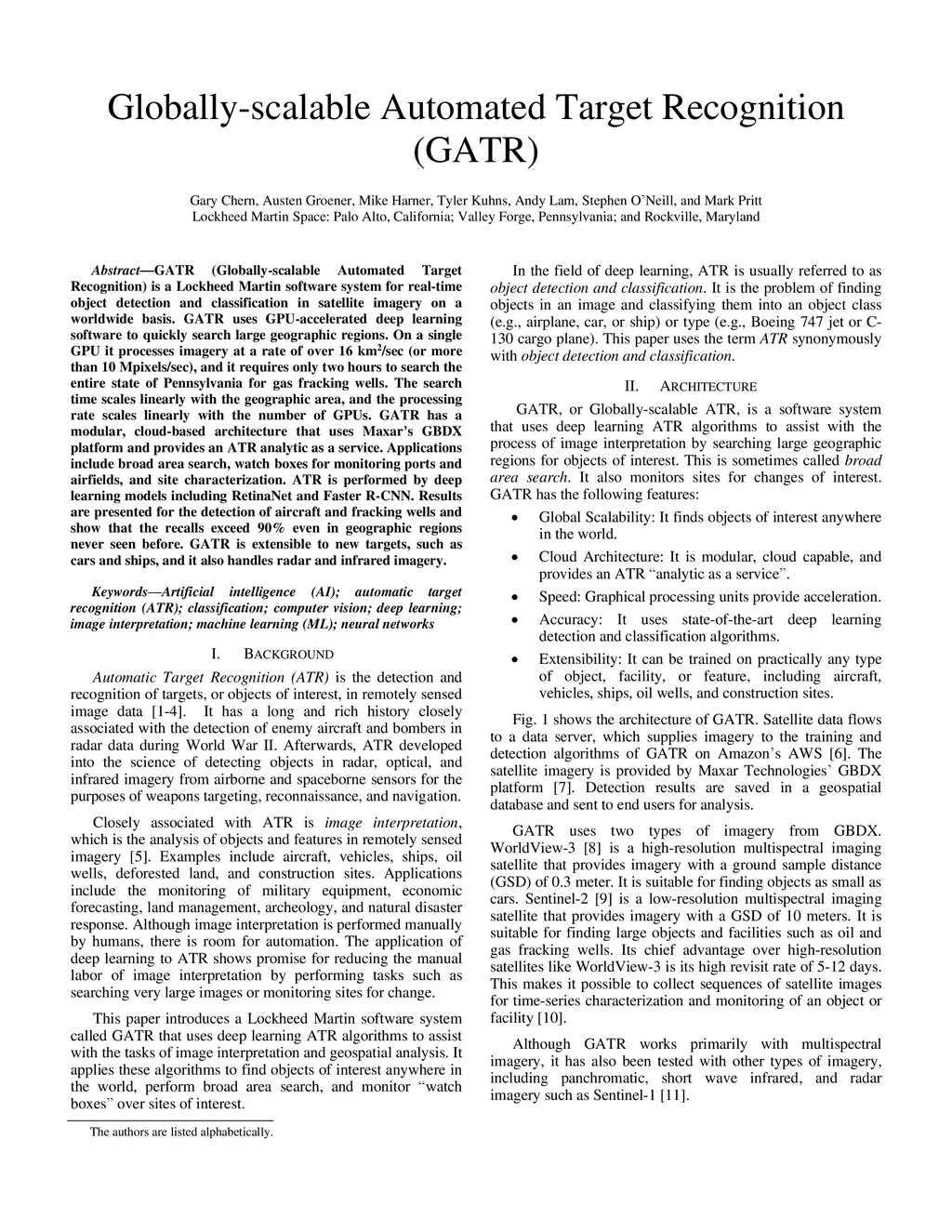 GATR (Globally-scalable Automated Target Recognition) is a Lockheed Martin software system for real-time object detection and classification in satellite imagery on a worldwide basis. GATR uses GPU-accelerated deep learning software to quickly search large geographic regions. On a single GPU it processes imagery at a rate of over 16 square km/sec (or more than 10 Mpixels/sec), and it requires only two hours to search the entire state of Pennsylvania for gas fracking wells. The search time scales linearly with the geographic area, and the processing rate scales linearly with the number of GPUs. GATR has a modular, cloud-based architecture that uses the Maxar GBDX platform and provides an ATR analytic as a service. Applications include broad area search, watch boxes for monitoring ports and airfields, and site characterization. ATR is performed by deep learning models including RetinaNet and Faster R-CNN. Results are presented for the detection of aircraft and fracking wells and show that the recalls exceed 90% even in geographic regions never seen before. GATR is extensible to new targets, such as cars and ships, and it also handles radar and infrared imagery.