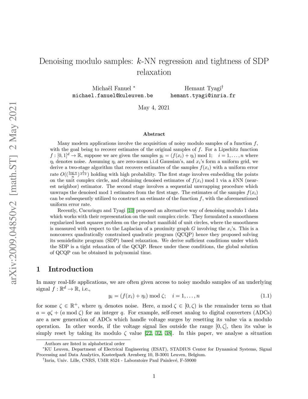 Denoising modulo samples: k-NN regression and tightness of SDP