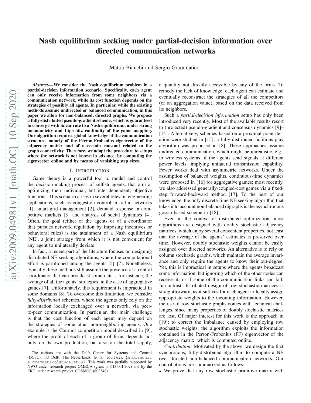 We consider the Nash equilibrium problem in a partial-decision information scenario. Specifically, each agent can only receive information from some neighbors via a communication network, while its cost function depends on the strategies of possibly all agents. In particular, while the existing methods assume undirected or balanced communication, in this paper we allow for non-balanced, directed graphs. We propose a fully-distributed pseudo-gradient scheme, which is guaranteed to converge with linear rate to a Nash equilibrium, under strong monotonicity and Lipschitz continuity of the game mapping. Our algorithm requires global knowledge of the communication structure, namely of the Perron-Frobenius eigenvector of the adjacency matrix and of a certain constant related to the graph connectivity. Therefore, we adapt the procedure to setups where the network is not known in advance, by computing the eigenvector online and by means of vanishing step sizes.