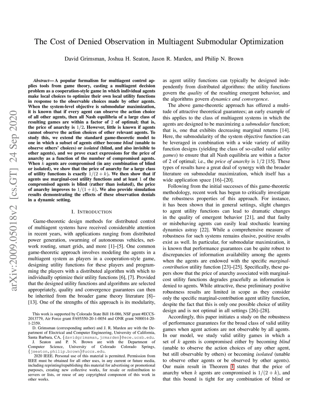 A popular formalism for multiagent control applies tools from game theory, casting a multiagent decision problem as a cooperation-style game in which individual agents make local choices to optimize their own local utility functions in response to the observable choices made by other agents. When the system-level objective is submodular maximization, it is known that if every agent can observe the action choice of all other agents, then all Nash equilibria of a large class of resulting games are within a factor of of optimal; that is, the price of anarchy is . However, little is known if agents cannot observe the action choices of other relevant agents. To study this, we extend the standard game-theoretic model to one in which a subset of agents either become \emph{blind} (unable to observe others' choices) or \emph{isolated} (blind, and also invisible to other agents), and we prove exact expressions for the price of anarchy as a function of the number of compromised agents. When agents are compromised (in any combination of blind or isolated), we show that the price of anarchy for a large class of utility functions is exactly . We then show that if agents use marginal-cost utility functions and at least of the compromised agents is blind (rather than isolated), the price of anarchy improves to . We also provide simulation results demonstrating the effects of these observation denials in a dynamic setting.