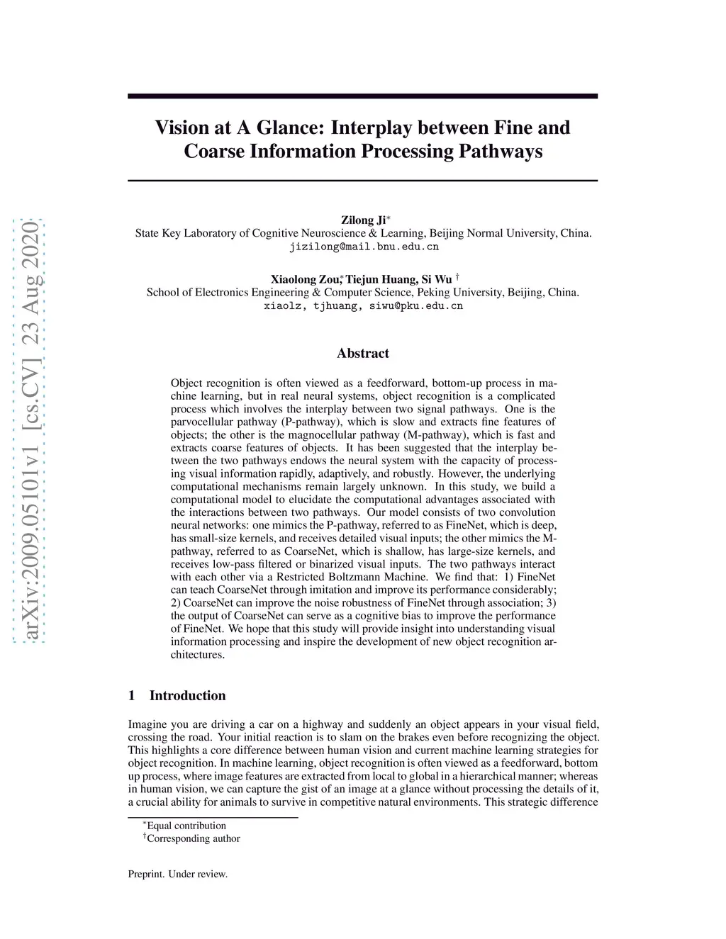 Object recognition is often viewed as a feedforward, bottom-up process in machine learning, but in real neural systems, object recognition is a complicated process which involves the interplay between two signal pathways. One is the parvocellular pathway (P-pathway), which is slow and extracts fine features of objects; the other is the magnocellular pathway (M-pathway), which is fast and extracts coarse features of objects. It has been suggested that the interplay between the two pathways endows the neural system with the capacity of processing visual information rapidly, adaptively, and robustly. However, the underlying computational mechanisms remain largely unknown. In this study, we build a computational model to elucidate the computational advantages associated with the interactions between two pathways. Our model consists of two convolution neural networks: one mimics the P-pathway, referred to as FineNet, which is deep, has small-size kernels, and receives detailed visual inputs; the other mimics the M-pathway, referred to as CoarseNet, which is shallow, has large-size kernels, and receives low-pass filtered or binarized visual inputs. The two pathways interact with each other via a Restricted Boltzmann Machine. We find that: 1) FineNet can teach CoarseNet through imitation and improve its performance considerably; 2) CoarseNet can improve the noise robustness of FineNet through association; 3) the output of CoarseNet can serve as a cognitive bias to improve the performance of FineNet. We hope that this study will provide insight into understanding visual information processing and inspire the development of new object recognition architectures.