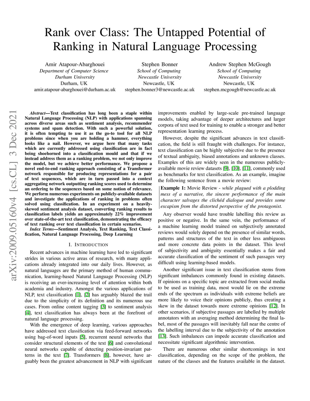 Text classification has long been a staple within Natural Language Processing (NLP) with applications spanning across diverse areas such as sentiment analysis, recommender systems and spam detection. With such a powerful solution, it is often tempting to use it as the go-to tool for all NLP problems since when you are holding a hammer, everything looks like a nail. However, we argue here that many tasks which are currently addressed using classification are in fact being shoehorned into a classification mould and that if we instead address them as a ranking problem, we not only improve the model, but we achieve better performance. We propose a novel end-to-end ranking approach consisting of a Transformer network responsible for producing representations for a pair of text sequences, which are in turn passed into a context aggregating network outputting ranking scores used to determine an ordering to the sequences based on some notion of relevance. We perform numerous experiments on publicly-available datasets and investigate the applications of ranking in problems often solved using classification. In an experiment on a heavily-skewed sentiment analysis dataset, converting ranking results to classification labels yields an approximately 22% improvement over state-of-the-art text classification, demonstrating the efficacy of text ranking over text classification in certain scenarios.
