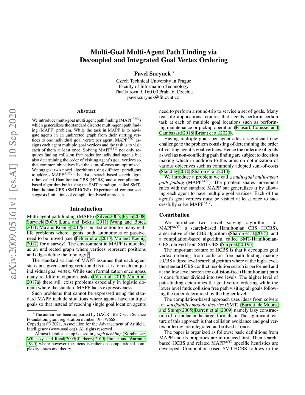We introduce multi-goal multi agent path finding (MAPF) which generalizes the standard discrete multi-agent path finding (MAPF) problem. While the task in MAPF is to navigate agents in an undirected graph from their starting vertices to one individual goal vertex per agent, MAPF assigns each agent multiple goal vertices and the task is to visit each of them at least once. Solving MAPF not only requires finding collision free paths for individual agents but also determining the order of visiting agent's goal vertices so that common objectives like the sum-of-costs are optimized. We suggest two novel algorithms using different paradigms to address MAPF: a heuristic search-based search algorithm called Hamiltonian-CBS (HCBS) and a compilation-based algorithm built using the SMT paradigm, called SMT-Hamiltonian-CBS (SMT-HCBS). Experimental comparison suggests limitations of compilation-based approach.