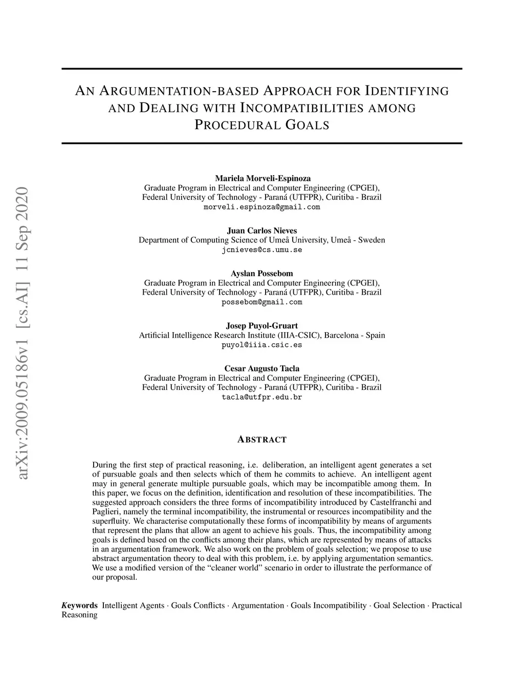 During the first step of practical reasoning, i.e. deliberation, an intelligent agent generates a set of pursuable goals and then selects which of them he commits to achieve. An intelligent agent may in general generate multiple pursuable goals, which may be incompatible among them. In this paper, we focus on the definition, identification and resolution of these incompatibilities. The suggested approach considers the three forms of incompatibility introduced by Castelfranchi and Paglieri, namely the terminal incompatibility, the instrumental or resources incompatibility and the superfluity. We characterise computationally these forms of incompatibility by means of arguments that represent the plans that allow an agent to achieve his goals. Thus, the incompatibility among goals is defined based on the conflicts among their plans, which are represented by means of attacks in an argumentation framework. We also work on the problem of goals selection; we propose to use abstract argumentation theory to deal with this problem, i.e. by applying argumentation semantics. We use a modified version of the "cleaner world" scenario in order to illustrate the performance of our proposal.