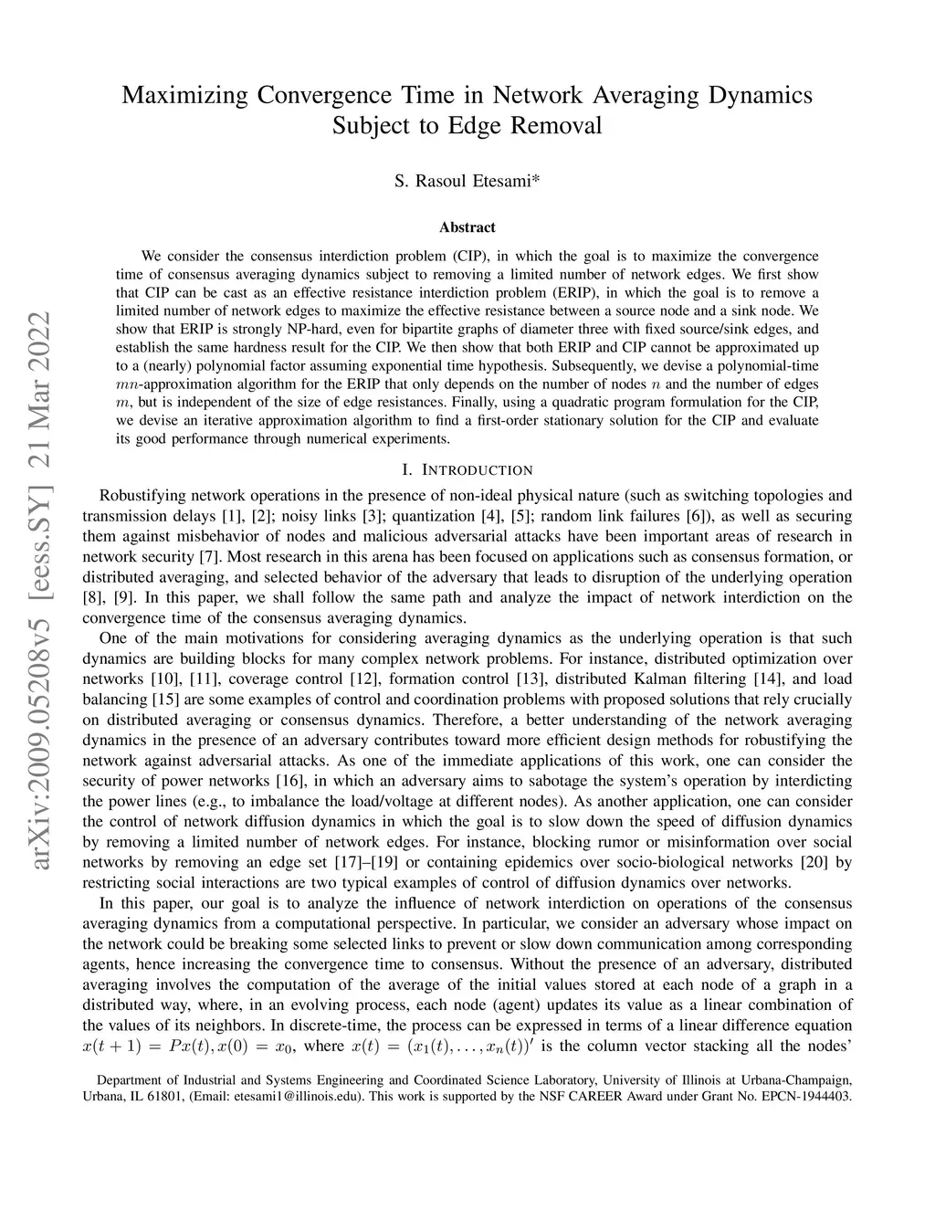 We consider the consensus interdiction problem (CIP), in which the goal is to maximize the convergence time of consensus averaging dynamics subject to removing a limited number of network edges. We first show that CIP can be cast as an effective resistance interdiction problem (ERIP), in which the goal is to remove a limited number of network edges to maximize the effective resistance between a source node and a sink node. We show that ERIP is strongly NP-hard, even for bipartite graphs of diameter three with fixed source/sink edges, and establish the same hardness result for the CIP. We then show that both ERIP and CIP cannot be approximated up to a (nearly) polynomial factor assuming exponential time hypothesis. Subsequently, we devise a polynomial-time -approximation algorithm for the ERIP that only depends on the number of nodes and the number of edges , but is independent of the size of edge resistances. Finally, using a quadratic program formulation for the CIP, we devise an iterative approximation algorithm to find a first-order stationary solution for the CIP and evaluate its good performance through numerical results.
