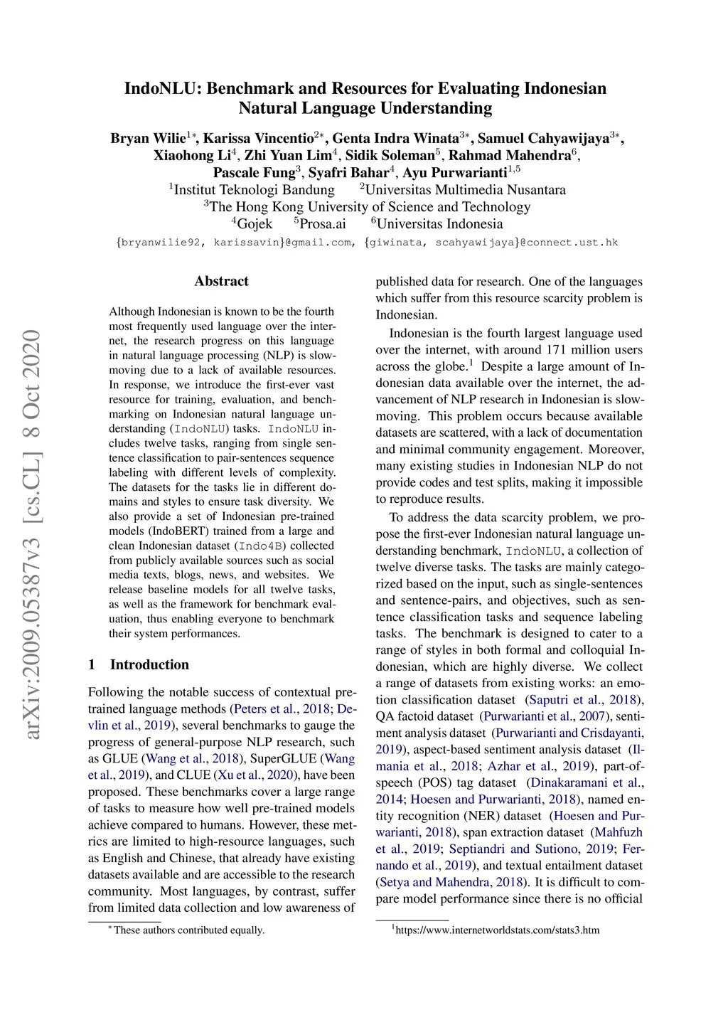 IndoNLU: Benchmark and Resources for Evaluating Indonesian Natural