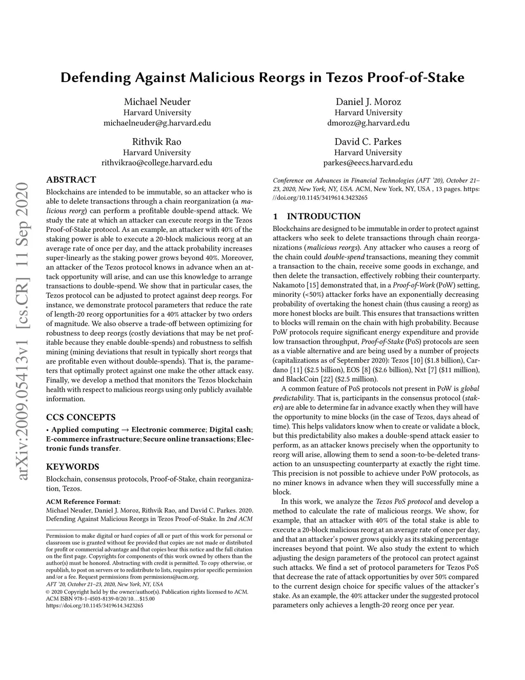 Blockchains are intended to be immutable, so an attacker who is able to delete transactions through a chain reorganization (a malicious reorg) can perform a profitable double-spend attack. We study the rate at which an attacker can execute reorgs in the Tezos Proof-of-Stake protocol. As an example, an attacker with 40% of the staking power is able to execute a 20-block malicious reorg at an average rate of once per day, and the attack probability increases super-linearly as the staking power grows beyond 40%. Moreover, an attacker of the Tezos protocol knows in advance when an attack opportunity will arise, and can use this knowledge to arrange transactions to double-spend. We show that in particular cases, the Tezos protocol can be adjusted to protect against deep reorgs. For instance, we demonstrate protocol parameters that reduce the rate of length-20 reorg opportunities for a 40% attacker by two orders of magnitude. We also observe a trade-off between optimizing for robustness to deep reorgs (costly deviations that may be net profitable because they enable double-spends) and robustness to selfish mining (mining deviations that result in typically short reorgs that are profitable even without double-spends). That is, the parameters that optimally protect against one make the other attack easy. Finally, we develop a method that monitors the Tezos blockchain health with respect to malicious reorgs using only publicly available information.