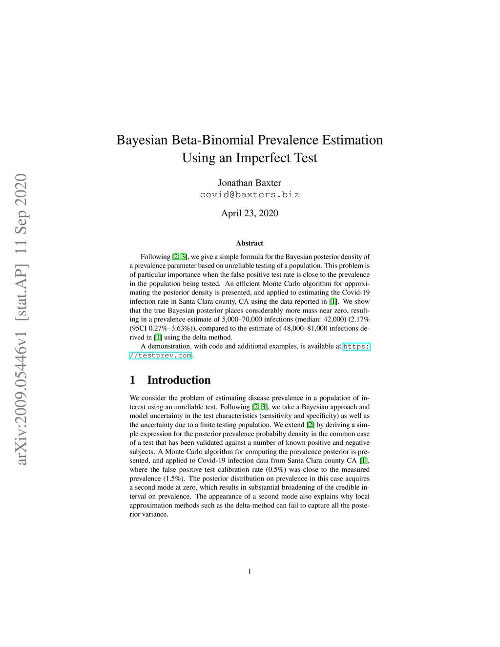 Following [Diggle 2011, Greenland 1995], we give a simple formula for the Bayesian posterior density of a prevalence parameter based on unreliable testing of a population. This problem is of particular importance when the false positive test rate is close to the prevalence in the population being tested. An efficient Monte Carlo algorithm for approximating the posterior density is presented, and applied to estimating the Covid-19 infection rate in Santa Clara county, CA using the data reported in [Bendavid 2020]. We show that the true Bayesian posterior places considerably more mass near zero, resulting in a prevalence estimate of 5,000--70,000 infections (median: 42,000) (2.17% (95CI 0.27%--3.63%)), compared to the estimate of 48,000--81,000 infections derived in [Bendavid 2020] using the delta method. A demonstration, with code and additional examples, is available at testprev.com.