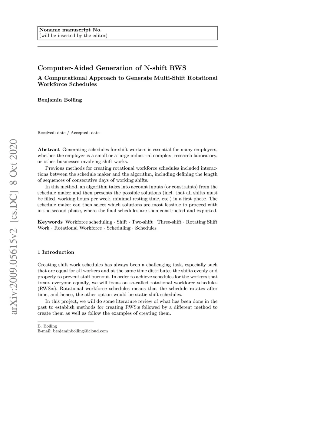Generating schedules for shift workers is essential for many employers, whether the employer is a small or a large industrial complex, research laboratory, or other businesses involving shift works. Previous methods for creating rotational workforce schedules included interactions between the schedule maker and the algorithm, including defining the length of sequences of consecutive days of working shifts. In this method, an algorithm takes into account inputs (or constraints) from the schedule maker and then presents the possible solutions (incl. that all shifts must be filled, working hours per week, minimal resting time, etc.) in a first phase. The schedule maker can then select which solutions are most feasible to proceed with in the second phase, where the final schedules are then constructed and exported.
