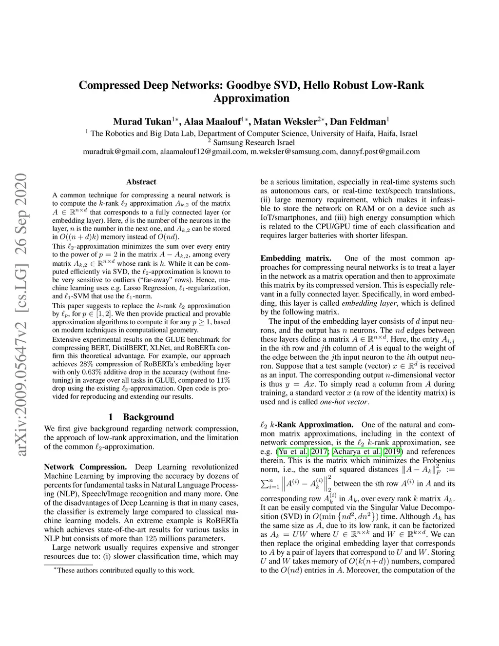 A common technique for compressing a neural network is to compute the -rank approximation of the matrix that corresponds to a fully connected layer (or embedding layer). Here, is the number of the neurons in the layer, is the number in the next one, and can be stored in memory instead of . This -approximation minimizes the sum over every entry to the power of in the matrix , among every matrix whose rank is . While it can be computed efficiently via SVD, the -approximation is known to be very sensitive to outliers ("far-away" rows). Hence, machine learning uses e.g. Lasso Regression, -regularization, and -SVM that use the -norm. This paper suggests to replace the -rank approximation by , for . We then provide practical and provable approximation algorithms to compute it for any , based on modern techniques in computational geometry. Extensive experimental results on the GLUE benchmark for compressing BERT, DistilBERT, XLNet, and RoBERTa confirm this theoretical advantage. For example, our approach achieves compression of RoBERTa's embedding layer with only additive drop in the accuracy (without fine-tuning) in average over all tasks in GLUE, compared to drop using the existing -approximation. Open code is provided for reproducing and extending our results.