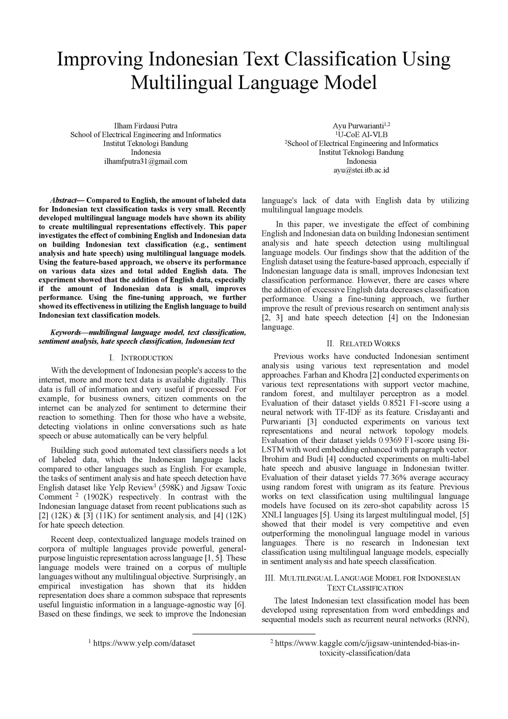 Improving Indonesian Text Classification Using Multilingual Language