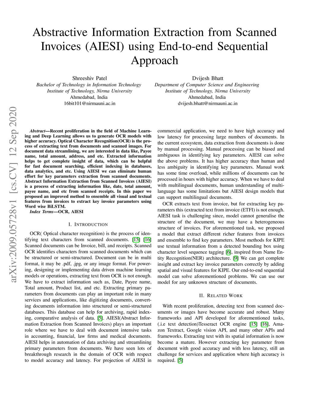 Recent proliferation in the field of Machine Learning and Deep Learning allows us to generate OCR models with higher accuracy. Optical Character Recognition(OCR) is the process of extracting text from documents and scanned images. For document data streamlining, we are interested in data like, Payee name, total amount, address, and etc. Extracted information helps to get complete insight of data, which can be helpful for fast document searching, efficient indexing in databases, data analytics, and etc. Using AIESI we can eliminate human effort for key parameters extraction from scanned documents. Abstract Information Extraction from Scanned Invoices (AIESI) is a process of extracting information like, date, total amount, payee name, and etc from scanned receipts. In this paper we proposed an improved method to ensemble all visual and textual features from invoices to extract key invoice parameters using Word wise BiLSTM.
