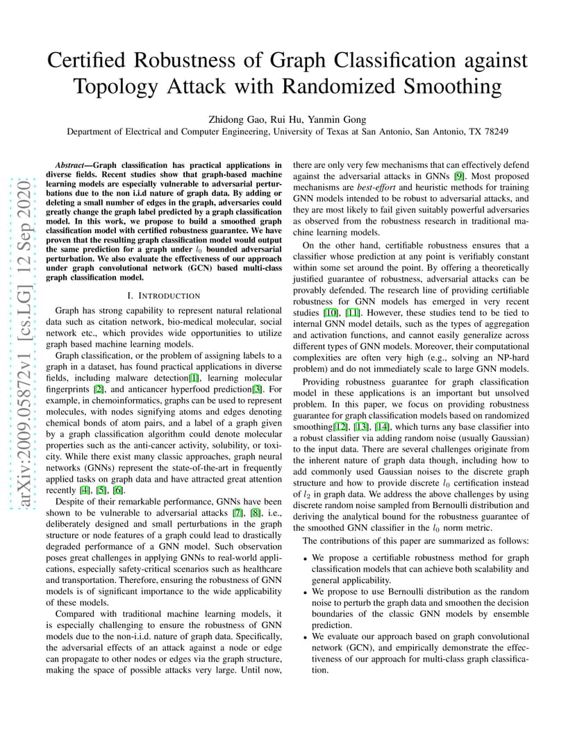 Graph classification has practical applications in diverse fields. Recent studies show that graph-based machine learning models are especially vulnerable to adversarial perturbations due to the non i.i.d nature of graph data. By adding or deleting a small number of edges in the graph, adversaries could greatly change the graph label predicted by a graph classification model. In this work, we propose to build a smoothed graph classification model with certified robustness guarantee. We have proven that the resulting graph classification model would output the same prediction for a graph under bounded adversarial perturbation. We also evaluate the effectiveness of our approach under graph convolutional network (GCN) based multi-class graph classification model.