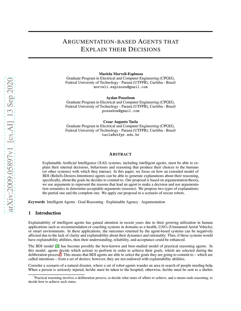 Explainable Artificial Intelligence (XAI) systems, including intelligent agents, must be able to explain their internal decisions, behaviours and reasoning that produce their choices to the humans (or other systems) with which they interact. In this paper, we focus on how an extended model of BDI (Beliefs-Desires-Intentions) agents can be able to generate explanations about their reasoning, specifically, about the goals he decides to commit to. Our proposal is based on argumentation theory, we use arguments to represent the reasons that lead an agent to make a decision and use argumentation semantics to determine acceptable arguments (reasons). We propose two types of explanations: the partial one and the complete one. We apply our proposal to a scenario of rescue robots.