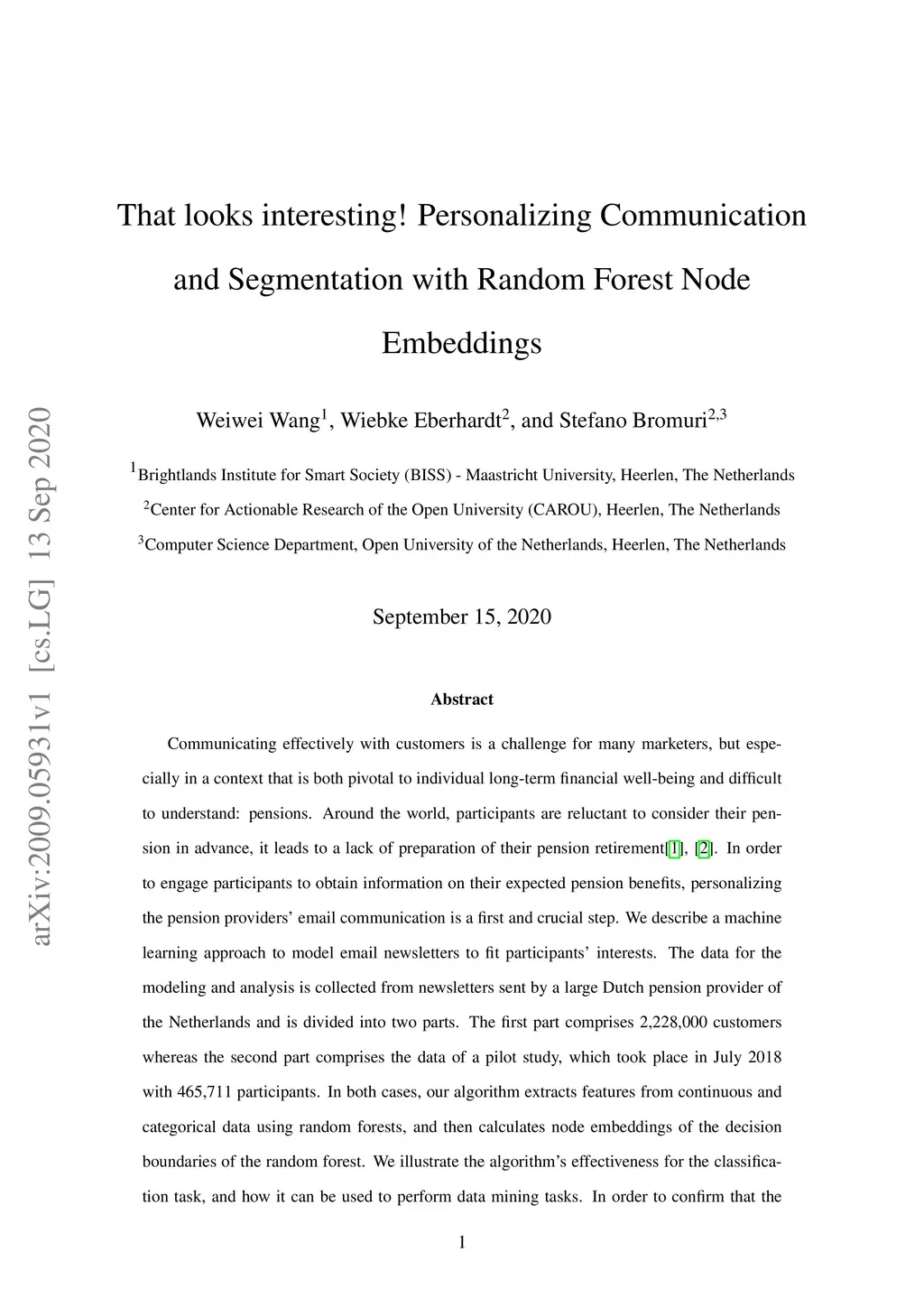 Communicating effectively with customers is a challenge for many marketers, but especially in a context that is both pivotal to individual long-term financial well-being and difficult to understand: pensions. Around the world, participants are reluctant to consider their pension in advance, it leads to a lack of preparation of their pension retirement [1], [2]. In order to engage participants to obtain information on their expected pension benefits, personalizing the pension providers' email communication is a first and crucial step. We describe a machine learning approach to model email newsletters to fit participants' interests. The data for the modeling and analysis is collected from newsletters sent by a large Dutch pension provider of the Netherlands and is divided into two parts. The first part comprises 2,228,000 customers whereas the second part comprises the data of a pilot study, which took place in July 2018 with 465,711 participants. In both cases, our algorithm extracts features from continuous and categorical data using random forests, and then calculates node embeddings of the decision boundaries of the random forest. We illustrate the algorithm's effectiveness for the classification task, and how it can be used to perform data mining tasks. In order to confirm that the result is valid for more than one data set, we also illustrate the properties of our algorithm in benchmark data sets concerning churning. In the data sets considered, the proposed modeling demonstrates competitive performance with respect to other state of the art approaches based on random forests, achieving the best Area Under the Curve (AUC) in the pension data set (0.948). For the descriptive part, the algorithm can identify customer segmentations that can be used by marketing departments to better target their communication towards their customers.