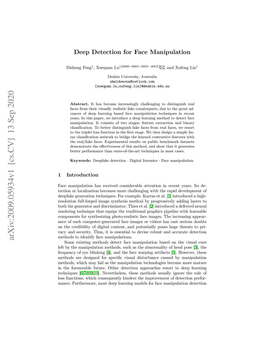 It has become increasingly challenging to distinguish real faces from their visually realistic fake counterparts, due to the great advances of deep learning based face manipulation techniques in recent years. In this paper, we introduce a deep learning method to detect face manipulation. It consists of two stages: feature extraction and binary classification. To better distinguish fake faces from real faces, we resort to the triplet loss function in the first stage. We then design a simple linear classification network to bridge the learned contrastive features with the real/fake faces. Experimental results on public benchmark datasets demonstrate the effectiveness of this method, and show that it generates better performance than state-of-the-art techniques in most cases.