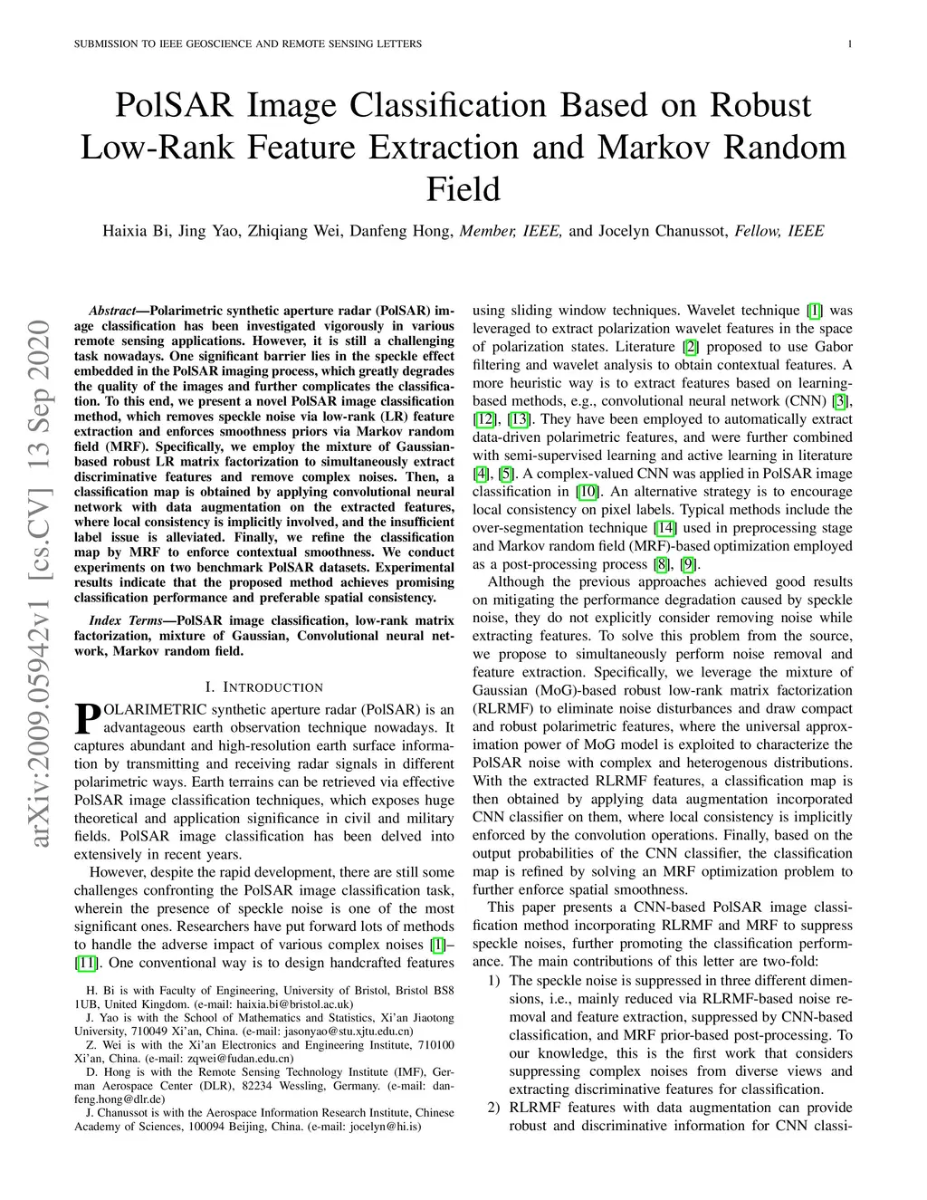 PolSAR Image Classification Based on Robust Low-Rank Feature Extraction