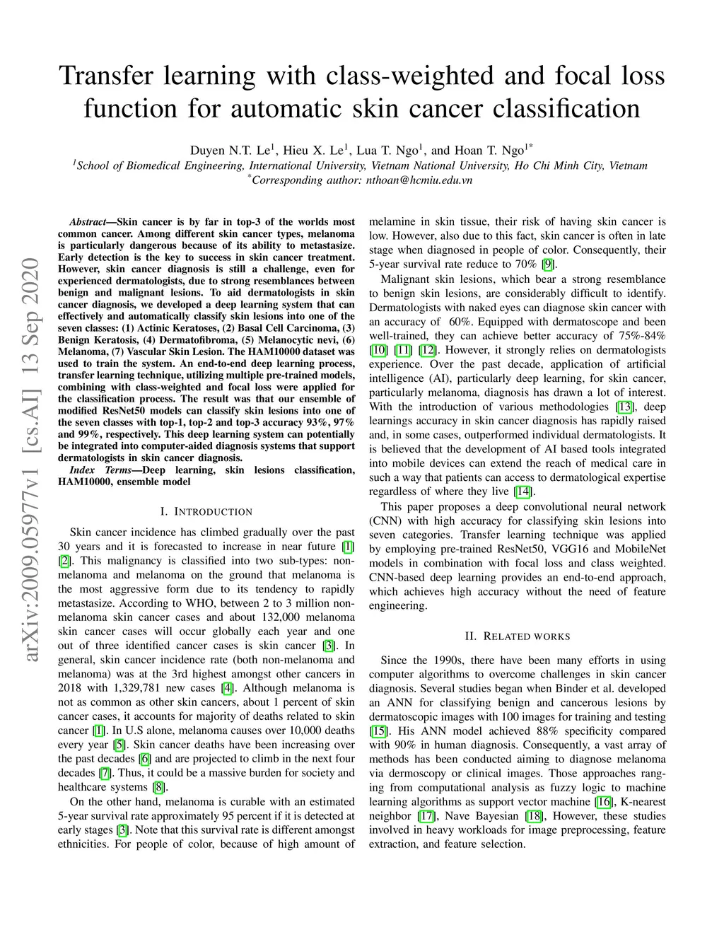 Skin cancer is by far in top-3 of the world's most common cancer. Among different skin cancer types, melanoma is particularly dangerous because of its ability to metastasize. Early detection is the key to success in skin cancer treatment. However, skin cancer diagnosis is still a challenge, even for experienced dermatologists, due to strong resemblances between benign and malignant lesions. To aid dermatologists in skin cancer diagnosis, we developed a deep learning system that can effectively and automatically classify skin lesions into one of the seven classes: (1) Actinic Keratoses, (2) Basal Cell Carcinoma, (3) Benign Keratosis, (4) Dermatofibroma, (5) Melanocytic nevi, (6) Melanoma, (7) Vascular Skin Lesion. The HAM10000 dataset was used to train the system. An end-to-end deep learning process, transfer learning technique, utilizing multiple pre-trained models, combining with class-weighted and focal loss were applied for the classification process. The result was that our ensemble of modified ResNet50 models can classify skin lesions into one of the seven classes with top-1, top-2 and top-3 accuracy 93%, 97% and 99%, respectively. This deep learning system can potentially be integrated into computer-aided diagnosis systems that support dermatologists in skin cancer diagnosis.