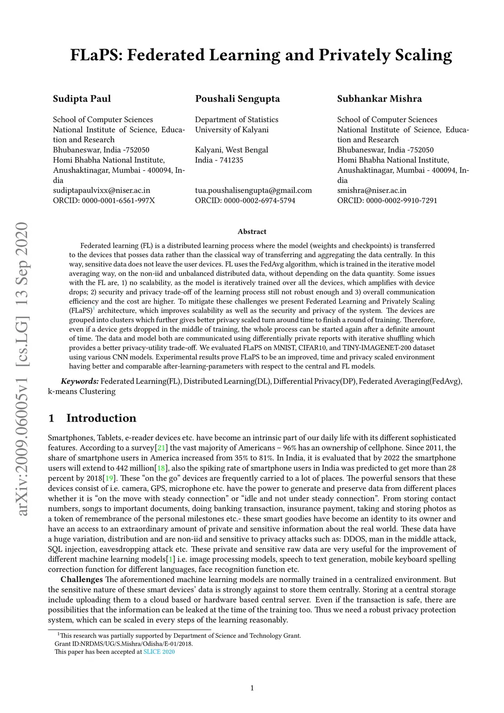 Federated learning (FL) is a distributed learning process where the model (weights and checkpoints) is transferred to the devices that posses data rather than the classical way of transferring and aggregating the data centrally. In this way, sensitive data does not leave the user devices. FL uses the FedAvg algorithm, which is trained in the iterative model averaging way, on the non-iid and unbalanced distributed data, without depending on the data quantity. Some issues with the FL are, 1) no scalability, as the model is iteratively trained over all the devices, which amplifies with device drops; 2) security and privacy trade-off of the learning process still not robust enough and 3) overall communication efficiency and the cost are higher. To mitigate these challenges we present Federated Learning and Privately Scaling (FLaPS) architecture, which improves scalability as well as the security and privacy of the system. The devices are grouped into clusters which further gives better privacy scaled turn around time to finish a round of training. Therefore, even if a device gets dropped in the middle of training, the whole process can be started again after a definite amount of time. The data and model both are communicated using differentially private reports with iterative shuffling which provides a better privacy-utility trade-off. We evaluated FLaPS on MNIST, CIFAR10, and TINY-IMAGENET-200 dataset using various CNN models. Experimental results prove FLaPS to be an improved, time and privacy scaled environment having better and comparable after-learning-parameters with respect to the central and FL models.