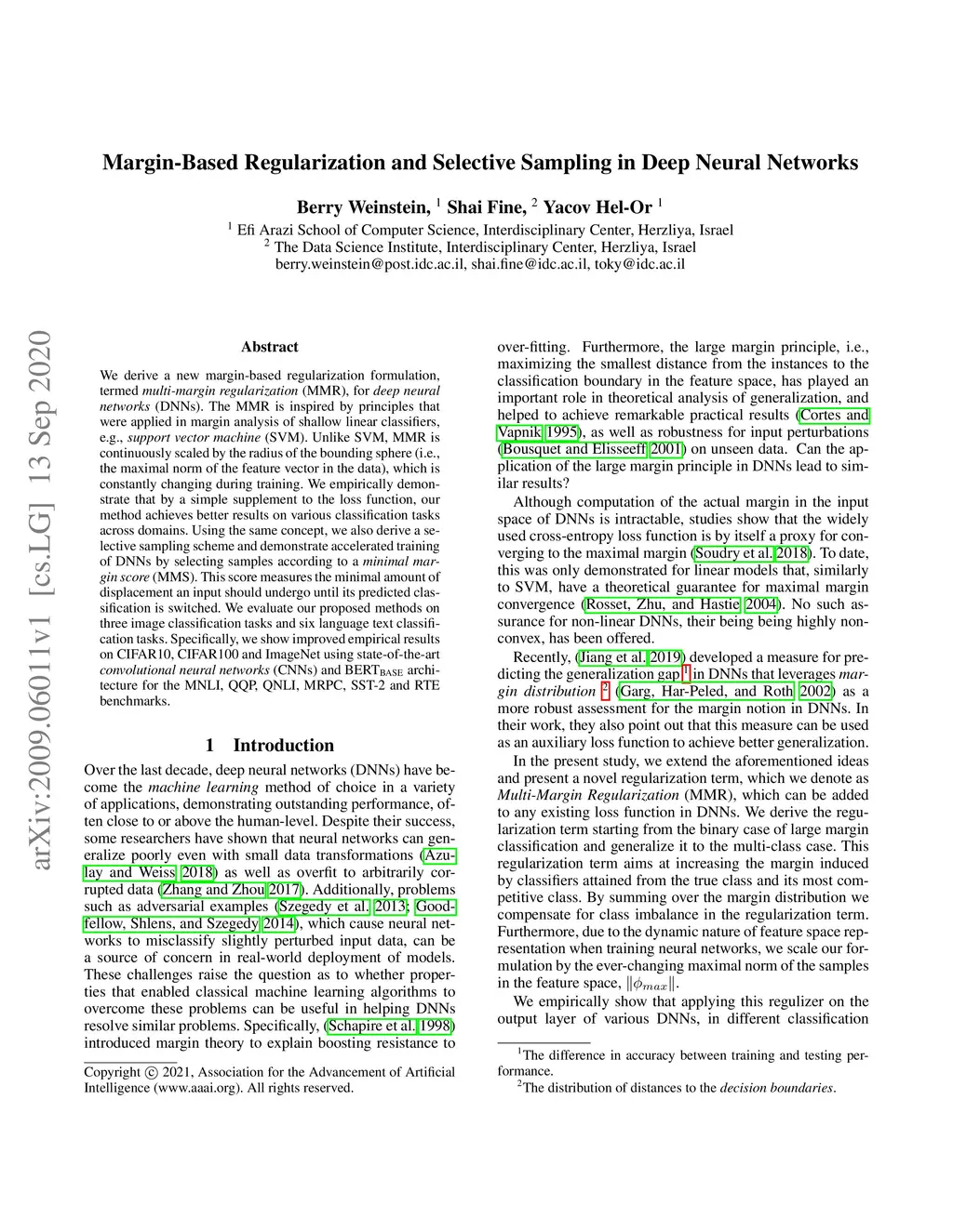 We derive a new margin-based regularization formulation, termed multi-margin regularization (MMR), for deep neural networks (DNNs). The MMR is inspired by principles that were applied in margin analysis of shallow linear classifiers, e.g., support vector machine (SVM). Unlike SVM, MMR is continuously scaled by the radius of the bounding sphere (i.e., the maximal norm of the feature vector in the data), which is constantly changing during training. We empirically demonstrate that by a simple supplement to the loss function, our method achieves better results on various classification tasks across domains. Using the same concept, we also derive a selective sampling scheme and demonstrate accelerated training of DNNs by selecting samples according to a minimal margin score (MMS). This score measures the minimal amount of displacement an input should undergo until its predicted classification is switched. We evaluate our proposed methods on three image classification tasks and six language text classification tasks. Specifically, we show improved empirical results on CIFAR10, CIFAR100 and ImageNet using state-of-the-art convolutional neural networks (CNNs) and BERT-BASE architecture for the MNLI, QQP, QNLI, MRPC, SST-2 and RTE benchmarks.
