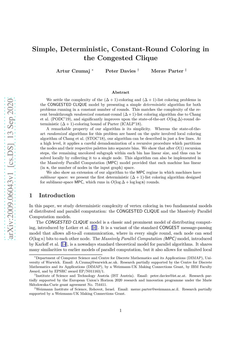 We settle the complexity of the -coloring and -list coloring problems in the CONGESTED CLIQUE model by presenting a simple deterministic algorithm for both problems running in a constant number of rounds. This matches the complexity of the recent breakthrough randomized constant-round -list coloring algorithm due to Chang et al. (PODC'19), and significantly improves upon the state-of-the-art -round deterministic -coloring bound of Parter (ICALP'18). A remarkable property of our algorithm is its simplicity. Whereas the state-of-the-art randomized algorithms for this problem are based on the quite involved local coloring algorithm of Chang et al. (STOC'18), our algorithm can be described in just a few lines. At a high level, it applies a careful derandomization of a recursive procedure which partitions the nodes and their respective palettes into separate bins. We show that after recursion steps, the remaining uncolored subgraph within each bin has linear size, and thus can be solved locally by collecting it to a single node. This algorithm can also be implemented in the Massively Parallel Computation (MPC) model provided that each machine has linear (in , the number of nodes in the input graph) space. We also show an extension of our algorithm to the MPC regime in which machines have sublinear space: we present the first deterministic -list coloring algorithm designed for sublinear-space MPC, which runs in rounds.