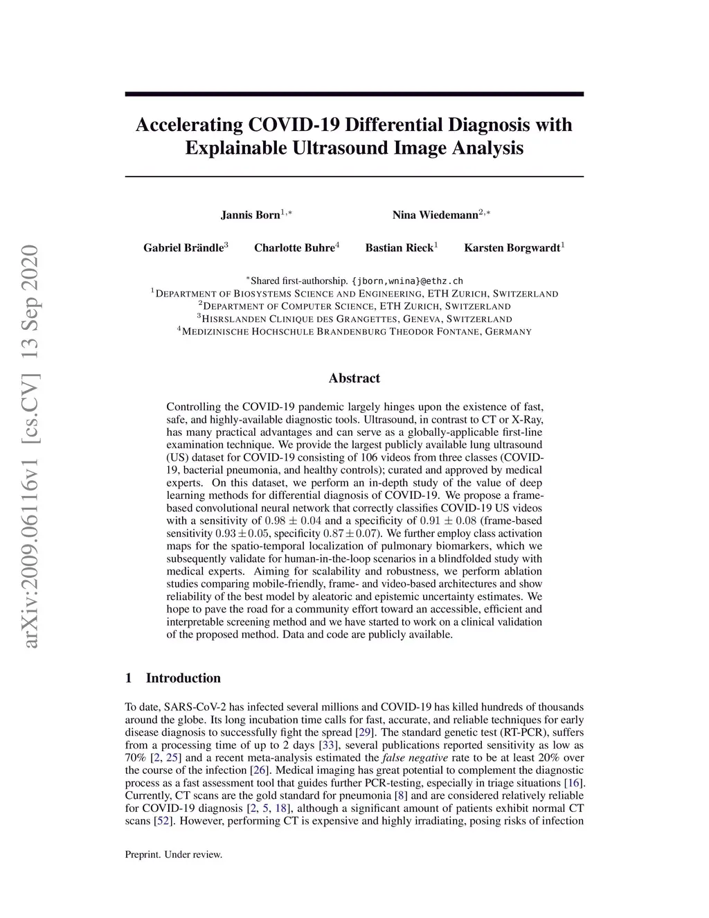 Controlling the COVID-19 pandemic largely hinges upon the existence of fast, safe, and highly-available diagnostic tools. Ultrasound, in contrast to CT or X-Ray, has many practical advantages and can serve as a globally-applicable first-line examination technique. We provide the largest publicly available lung ultrasound (US) dataset for COVID-19 consisting of 106 videos from three classes (COVID-19, bacterial pneumonia, and healthy controls); curated and approved by medical experts. On this dataset, we perform an in-depth study of the value of deep learning methods for differential diagnosis of COVID-19. We propose a frame-based convolutional neural network that correctly classifies COVID-19 US videos with a sensitivity of 0.98+-0.04 and a specificity of 0.91+-08 (frame-based sensitivity 0.93+-0.05, specificity 0.87+-0.07). We further employ class activation maps for the spatio-temporal localization of pulmonary biomarkers, which we subsequently validate for human-in-the-loop scenarios in a blindfolded study with medical experts. Aiming for scalability and robustness, we perform ablation studies comparing mobile-friendly, frame- and video-based architectures and show reliability of the best model by aleatoric and epistemic uncertainty estimates. We hope to pave the road for a community effort toward an accessible, efficient and interpretable screening method and we have started to work on a clinical validation of the proposed method. Data and code are publicly available.