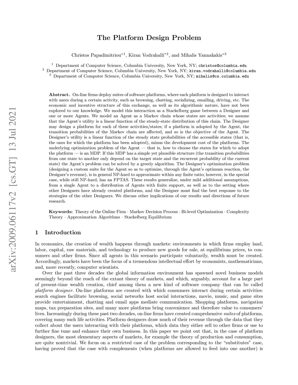On-line firms deploy suites of software platforms, where each platform is designed to interact with users during a certain activity, such as browsing, chatting, socializing, emailing, driving, etc. The economic and incentive structure of this exchange, as well as its algorithmic nature, have not been explored to our knowledge. We model this interaction as a Stackelberg game between a Designer and one or more Agents. We model an Agent as a Markov chain whose states are activities; we assume that the Agent's utility is a linear function of the steady-state distribution of this chain. The Designer may design a platform for each of these activities/states; if a platform is adopted by the Agent, the transition probabilities of the Markov chain are affected, and so is the objective of the Agent. The Designer's utility is a linear function of the steady state probabilities of the accessible states minus the development cost of the platforms. The underlying optimization problem of the Agent -- how to choose the states for which to adopt the platform -- is an MDP. If this MDP has a simple yet plausible structure (the transition probabilities from one state to another only depend on the target state and the recurrent probability of the current state) the Agent's problem can be solved by a greedy algorithm. The Designer's optimization problem (designing a custom suite for the Agent so as to optimize, through the Agent's optimum reaction, the Designer's revenue), is NP-hard to approximate within any finite ratio; however, the special case, while still NP-hard, has an FPTAS. These results generalize from a single Agent to a distribution of Agents with finite support, as well as to the setting where the Designer must find the best response to the existing strategies of other Designers. We discuss other implications of our results and directions of future research.