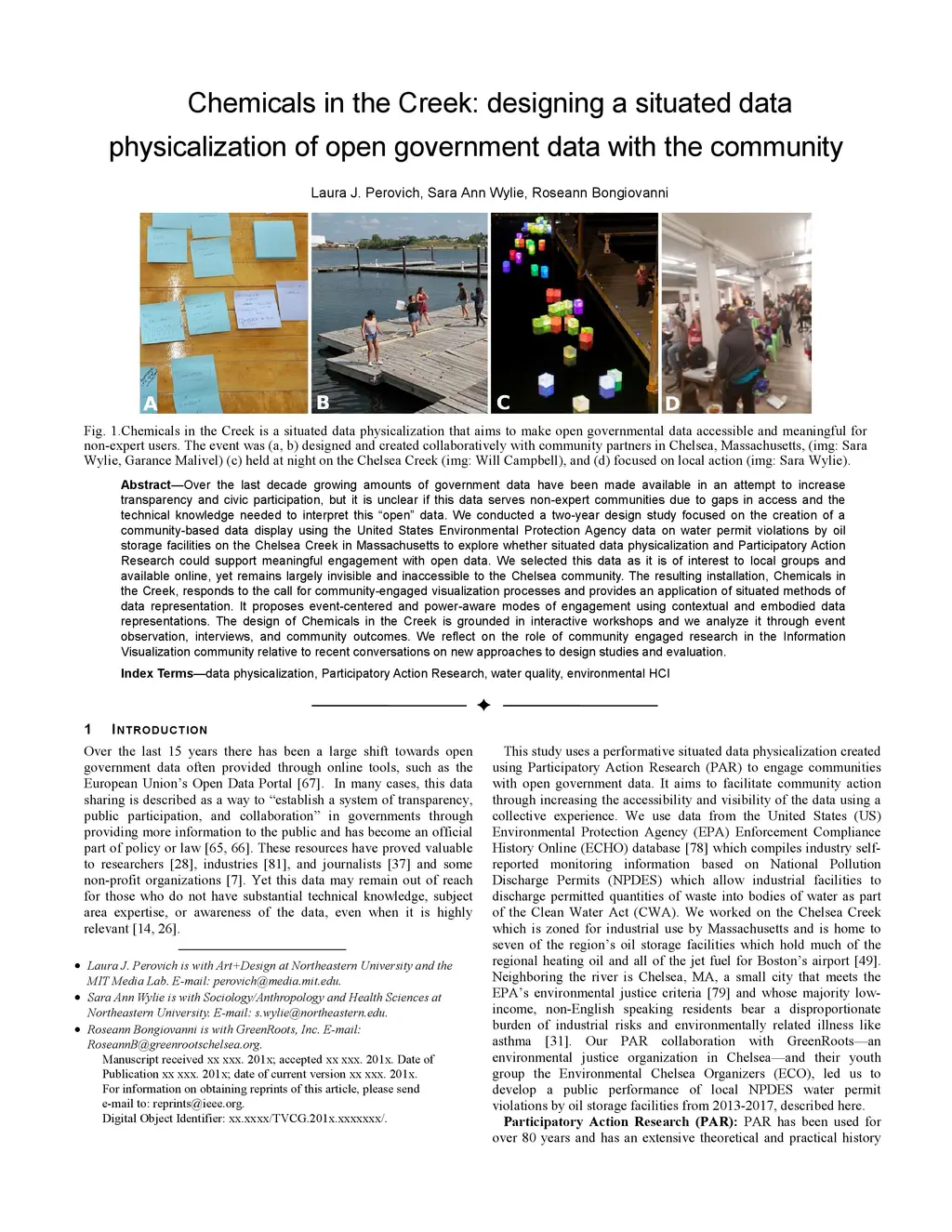 Over the last decade growing amounts of government data have been made available in an attempt to increase transparency and civic participation, but it is unclear if this data serves non-expert communities due to gaps in access and the technical knowledge needed to interpret this "open" data. We conducted a two-year design study focused on the creation of a community-based data display using the United States Environmental Protection Agency data on water permit violations by oil storage facilities on the Chelsea Creek in Massachusetts to explore whether situated data physicalization and Participatory Action Research could support meaningful engagement with open data. We selected this data as it is of interest to local groups and available online, yet remains largely invisible and inaccessible to the Chelsea community. The resulting installation, Chemicals in the Creek, responds to the call for community-engaged visualization processes and provides an application of situated methods of data representation. It proposes event-centered and power-aware modes of engagement using contextual and embodied data representations. The design of Chemicals in the Creek is grounded in interactive workshops and we analyze it through event observation, interviews, and community outcomes. We reflect on the role of community engaged research in the Information Visualization community relative to recent conversations on new approaches to design studies and evaluation.