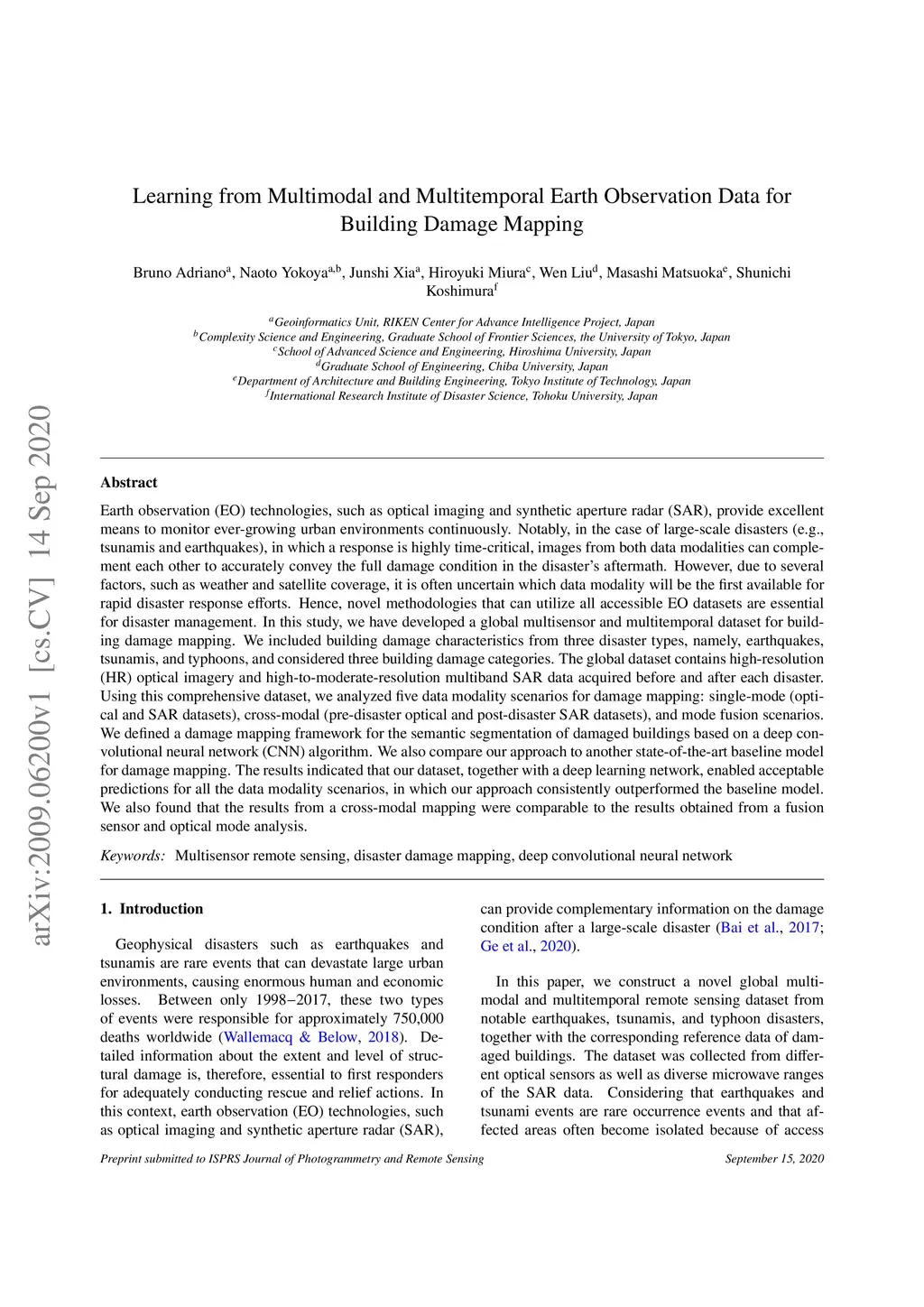 Earth observation technologies, such as optical imaging and synthetic aperture radar (SAR), provide excellent means to monitor ever-growing urban environments continuously. Notably, in the case of large-scale disasters (e.g., tsunamis and earthquakes), in which a response is highly time-critical, images from both data modalities can complement each other to accurately convey the full damage condition in the disaster's aftermath. However, due to several factors, such as weather and satellite coverage, it is often uncertain which data modality will be the first available for rapid disaster response efforts. Hence, novel methodologies that can utilize all accessible EO datasets are essential for disaster management. In this study, we have developed a global multisensor and multitemporal dataset for building damage mapping. We included building damage characteristics from three disaster types, namely, earthquakes, tsunamis, and typhoons, and considered three building damage categories. The global dataset contains high-resolution optical imagery and high-to-moderate-resolution multiband SAR data acquired before and after each disaster. Using this comprehensive dataset, we analyzed five data modality scenarios for damage mapping: single-mode (optical and SAR datasets), cross-modal (pre-disaster optical and post-disaster SAR datasets), and mode fusion scenarios. We defined a damage mapping framework for the semantic segmentation of damaged buildings based on a deep convolutional neural network algorithm. We compare our approach to another state-of-the-art baseline model for damage mapping. The results indicated that our dataset, together with a deep learning network, enabled acceptable predictions for all the data modality scenarios.