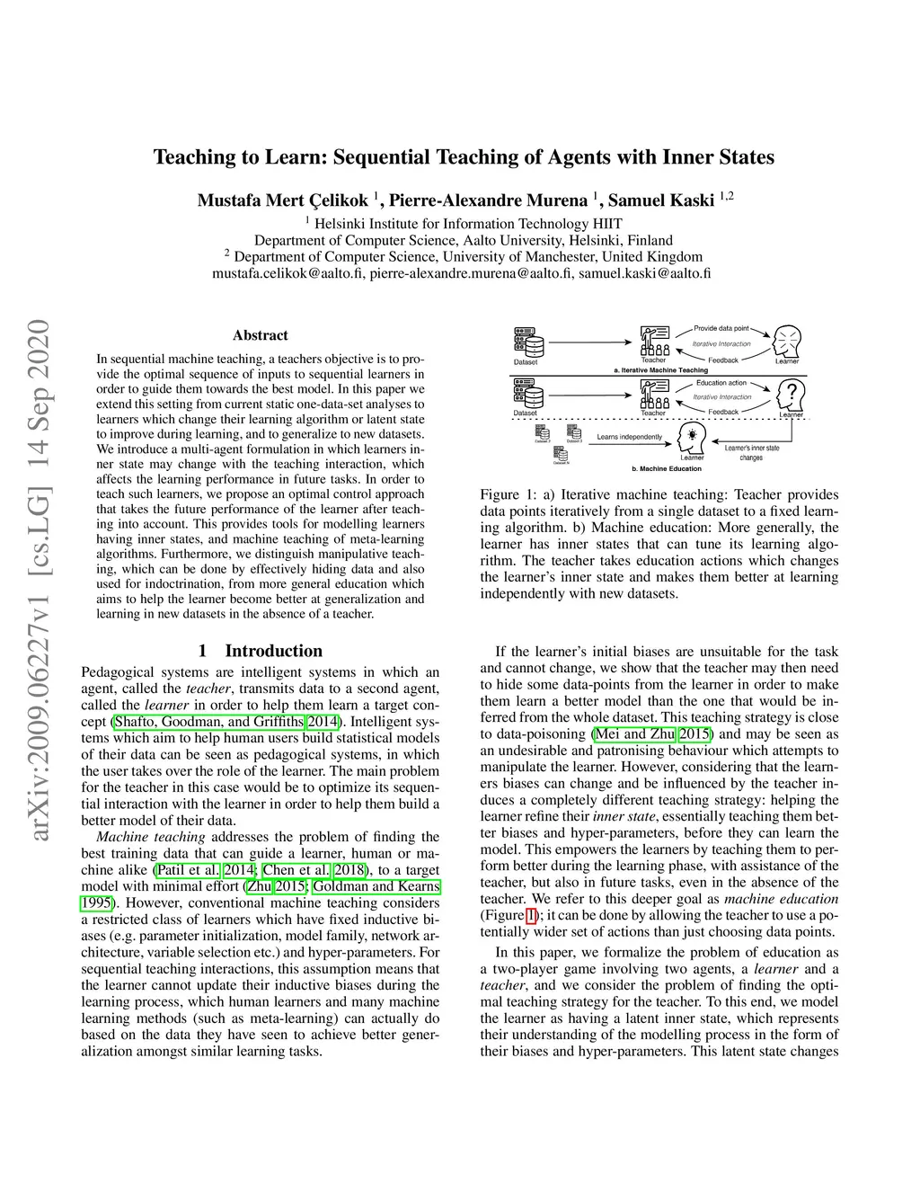 In sequential machine teaching, a teacher's objective is to provide the optimal sequence of inputs to sequential learners in order to guide them towards the best model. In this paper we extend this setting from current static one-data-set analyses to learners which change their learning algorithm or latent state to improve during learning, and to generalize to new datasets. We introduce a multi-agent formulation in which learners' inner state may change with the teaching interaction, which affects the learning performance in future tasks. In order to teach such learners, we propose an optimal control approach that takes the future performance of the learner after teaching into account. This provides tools for modelling learners having inner states, and machine teaching of meta-learning algorithms. Furthermore, we distinguish manipulative teaching, which can be done by effectively hiding data and also used for indoctrination, from more general education which aims to help the learner become better at generalization and learning in new datasets in the absence of a teacher.