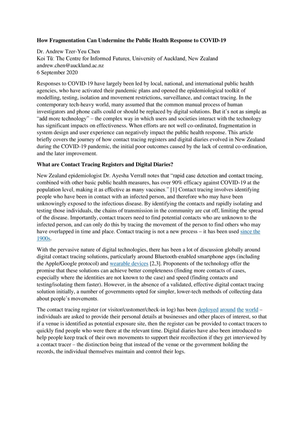 Responses to COVID-19 have largely been led by local, national, and international public health agencies, who have activated their pandemic plans and opened the epidemiological toolkit of modelling, testing, isolation and movement restrictions, surveillance, and contact tracing. In the contemporary tech-heavy world, many assumed that the common manual process of human investigators and phone calls could or should be replaced by digital solutions. But it's not as simple as "add more technology" - the complex way in which users and societies interact with the technology has significant impacts on effectiveness. When efforts are not well co-ordinated, fragmentation in system design and user experience can negatively impact the public health response. This article briefly covers the journey of how contact tracing registers and digital diaries evolved in New Zealand during the COVID-19 pandemic, the initial poor outcomes caused by the lack of central co-ordination, and the later improvement.